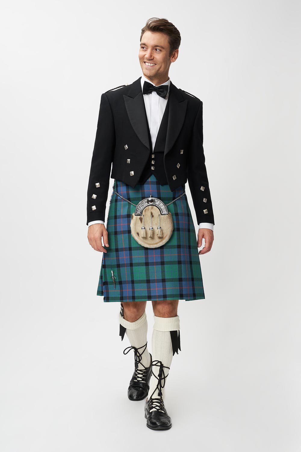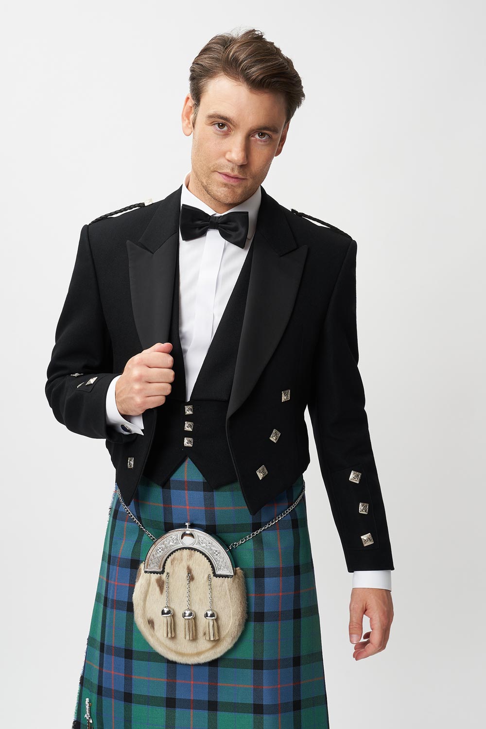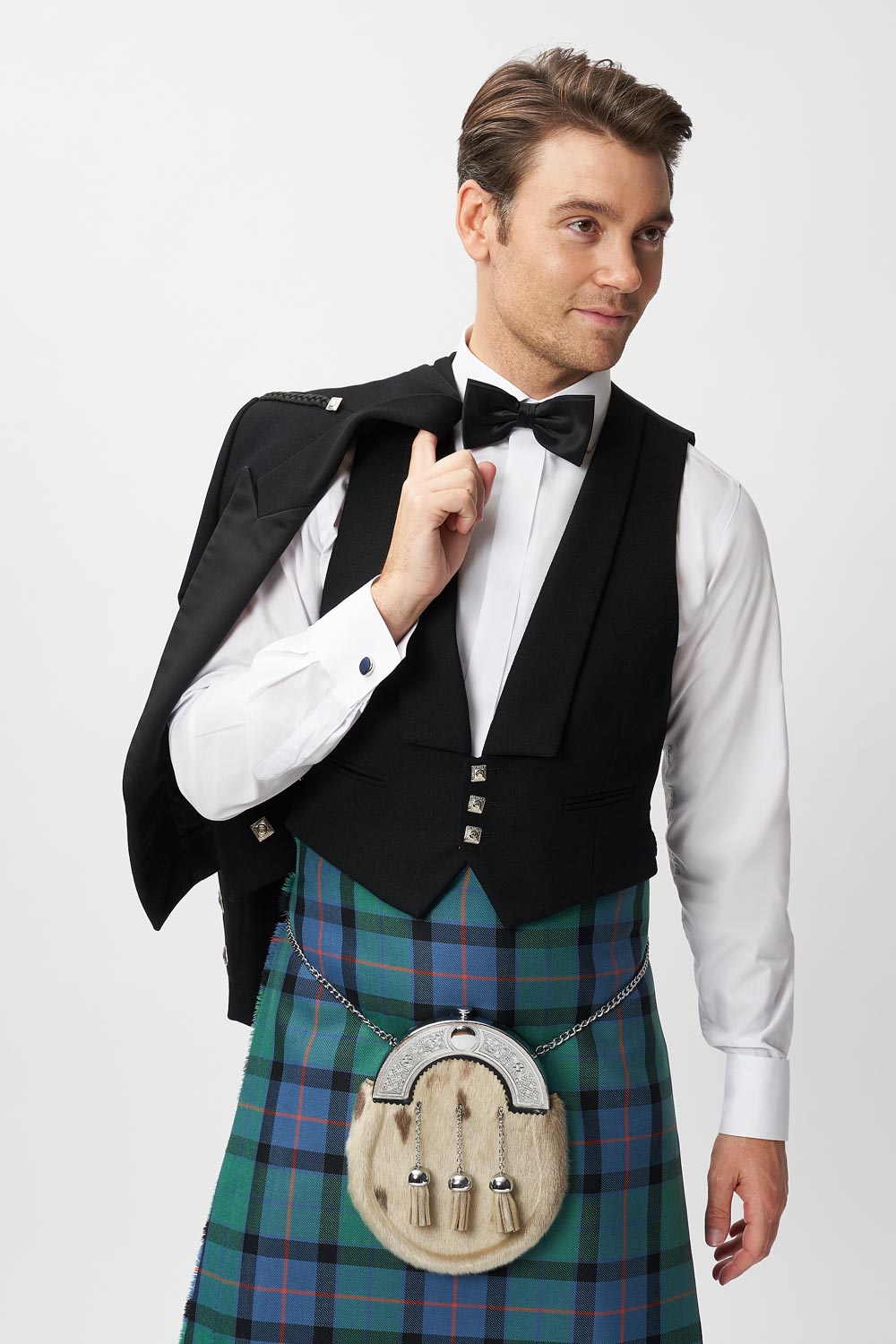 The Prince Charlie jacket paired with the Flower of Scotland Kilt, a highland classic for formal wear. Always wear a bow tie with the 3-button waistcoat. Found in the Prince Charlie styling bundle. Hire this immaculate ensemble from Rathbones Tailor now.