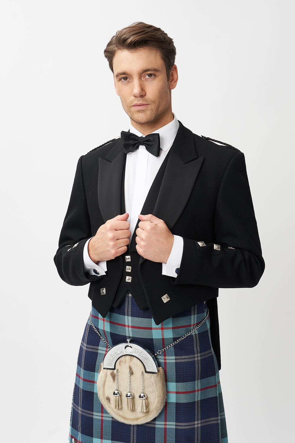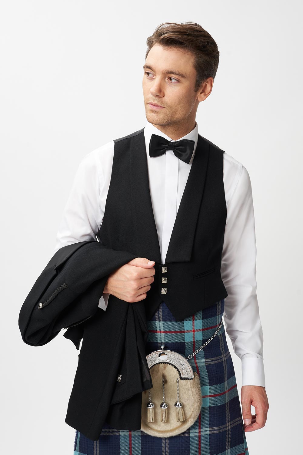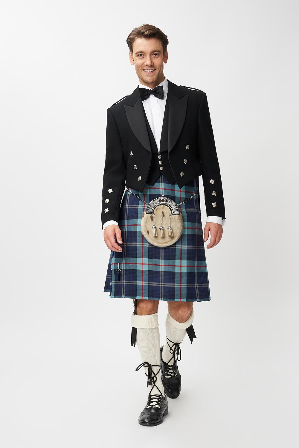 The famous charity Help for Heroes tartan, paired with the Prince Charlie jacket and waistcoat. Available to hire from Rathbones Tailor. Fabulous highland dress for your next event, be it a wedding kilt of black tie event.