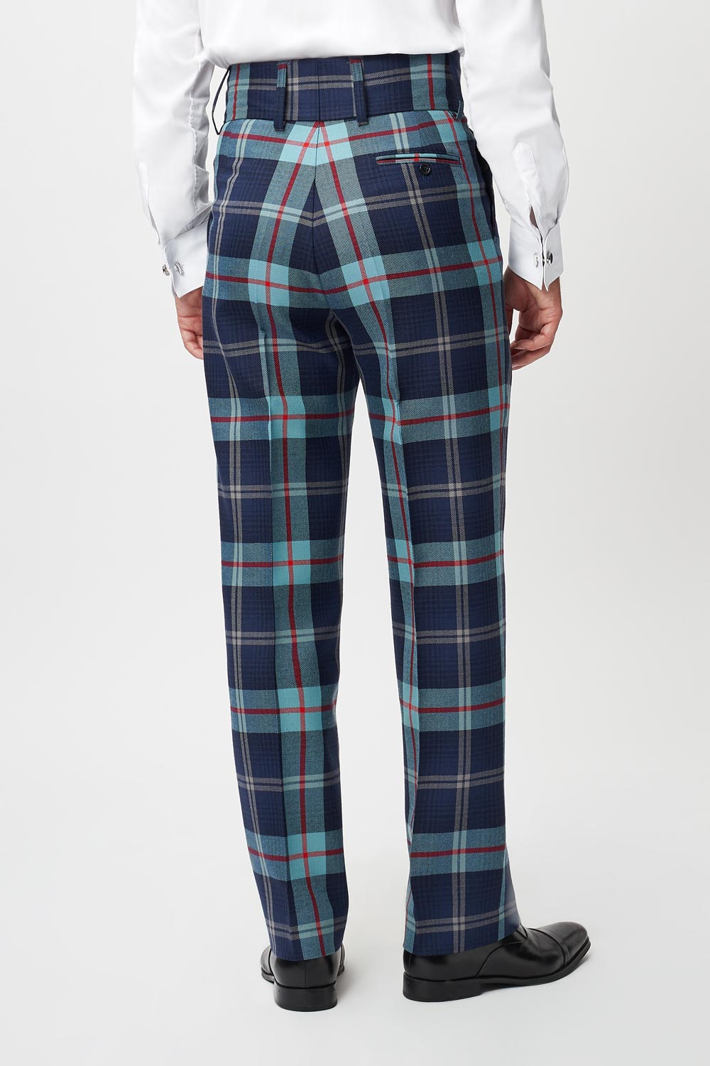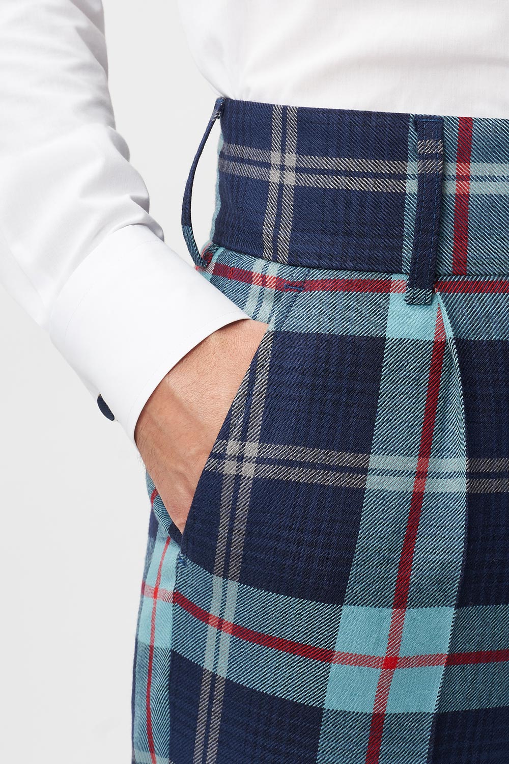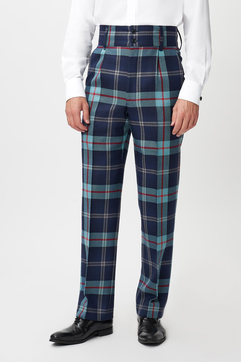 For the trews, take a true waist measurement (around the belly button) as they sit higher on the waist. The belt isn't essential wearing as long as the waistcoat covers the top of the trousers. The low three button waistcoat means a bow tie is the choice of accessory.