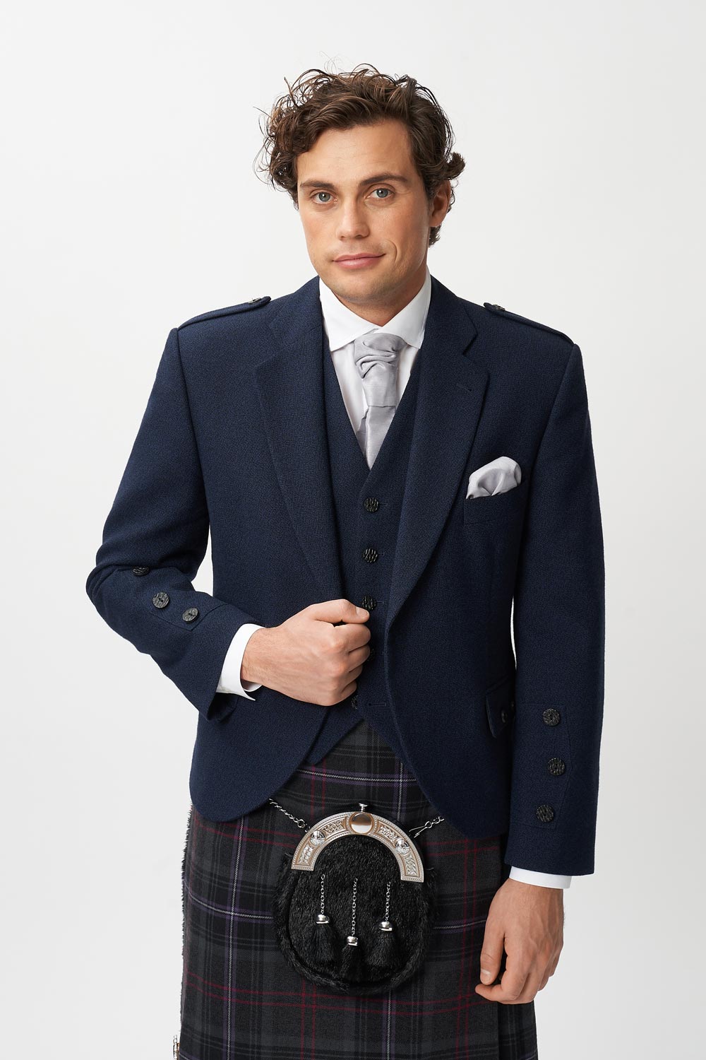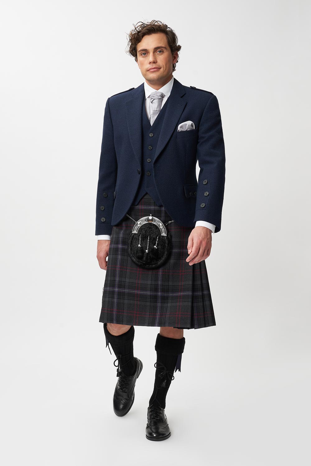 Hire the Scottish Spirit kilt with our navy tweed jacket and waistcoat for a fresh revamp of the classic argyle jacket. Highland, but make it modern! Your choice to match the hose with the jacket, or clash for a bit of a statement.