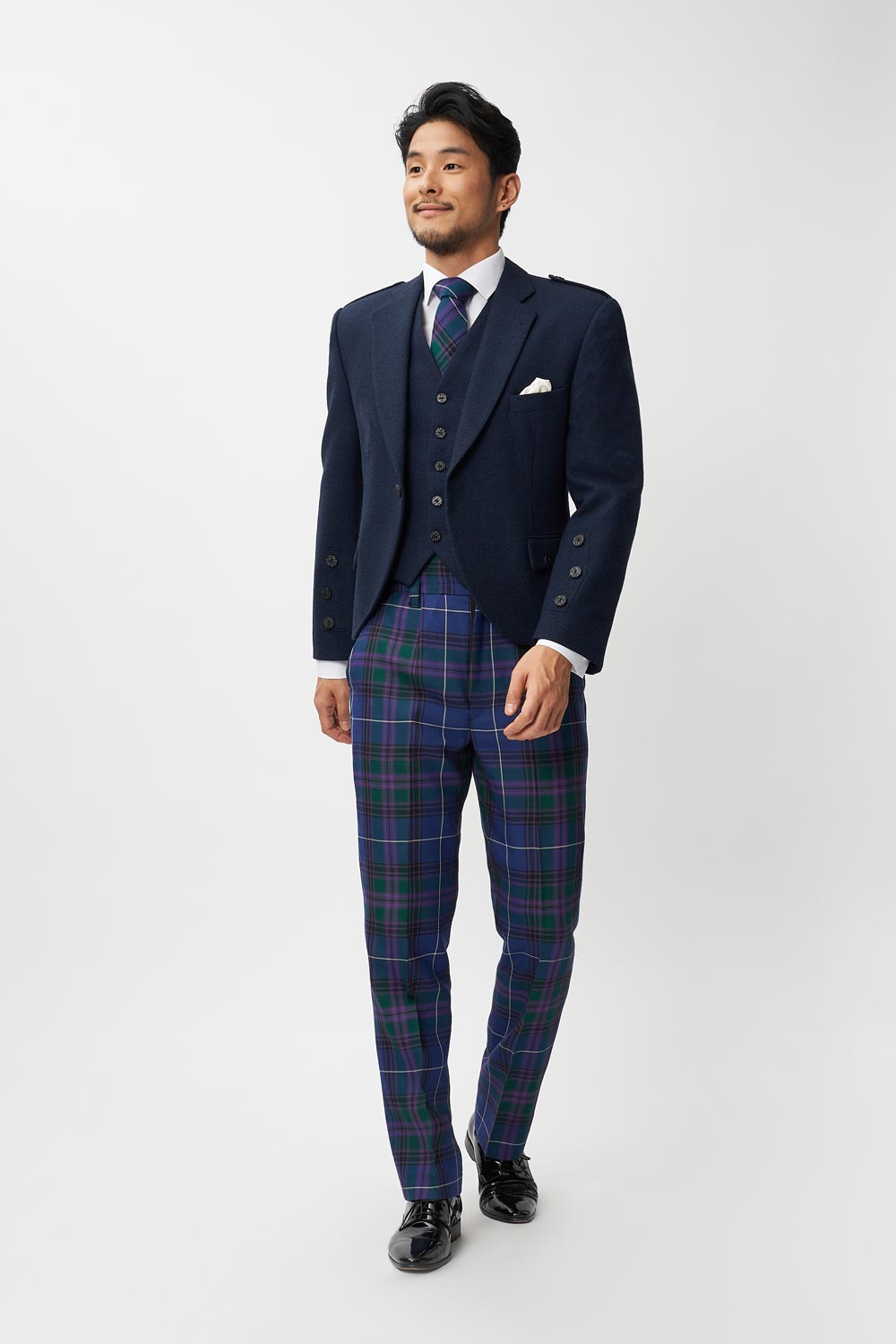The Spirit of Bannockburn trews. Originally a winter option, but definitely not limited to colder climates. Hire the Spirit of Bannockburn trews with our navy tweed jacket and waistcoat for a modern, sophisticated highland look.