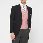 The Bidwell 3 Piece morning suit in Black Herringbone. Available to hire, paired with the Pale Pink Double Breasted waistcoat - Hire this classic three piece regular fit morning suit with a timeless cut and straight leg trousers. Rent this morning suit for a day at the races, for your groomsmen, or just because you feel fancy. Your call. Prepare your version of a humble thank you for all the compliments you're guaranteed to receive. Runs true to size. If between jacket sizes, we recommend dropping down. Select either Black Herringbone or Grey Pinstripe trousers.