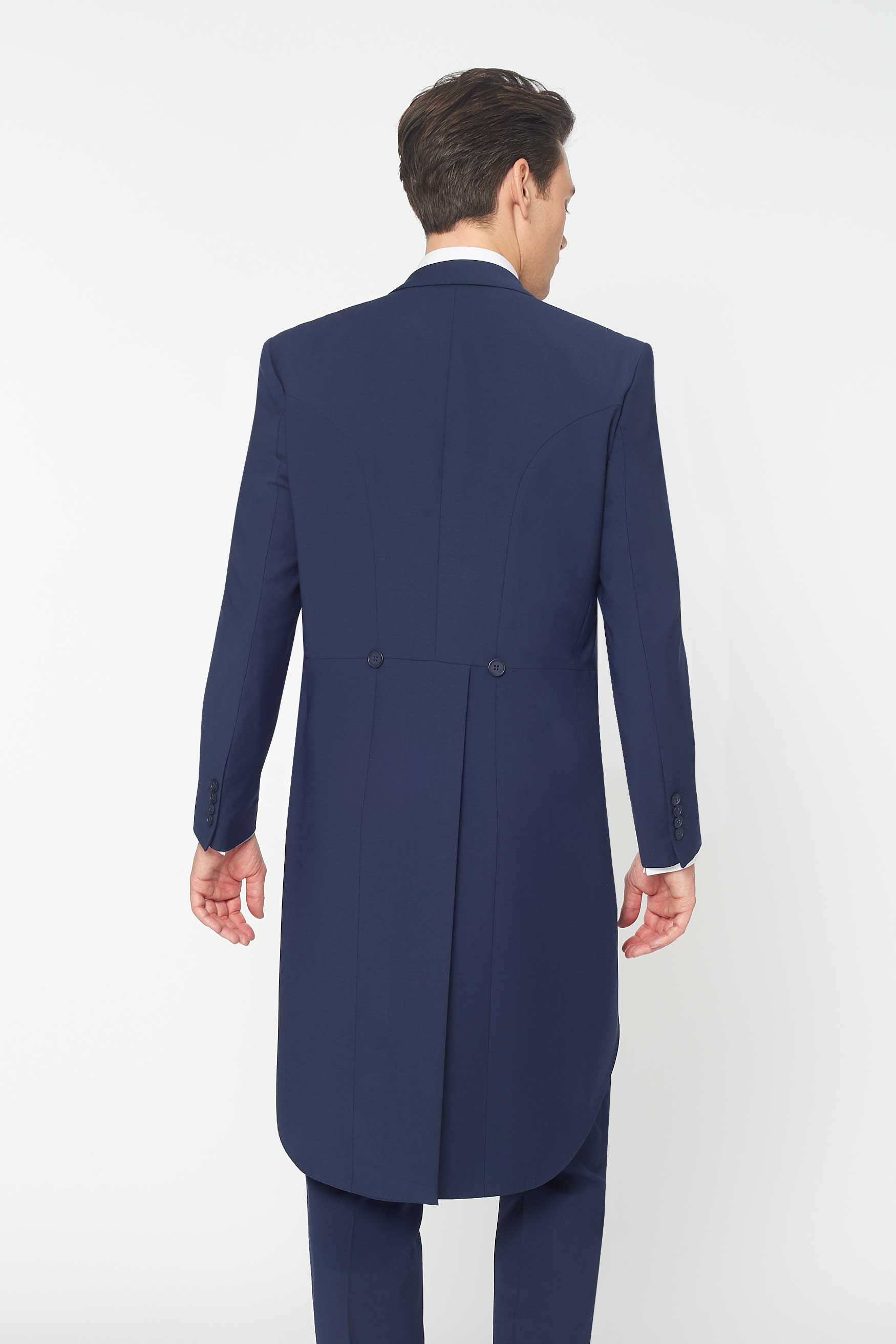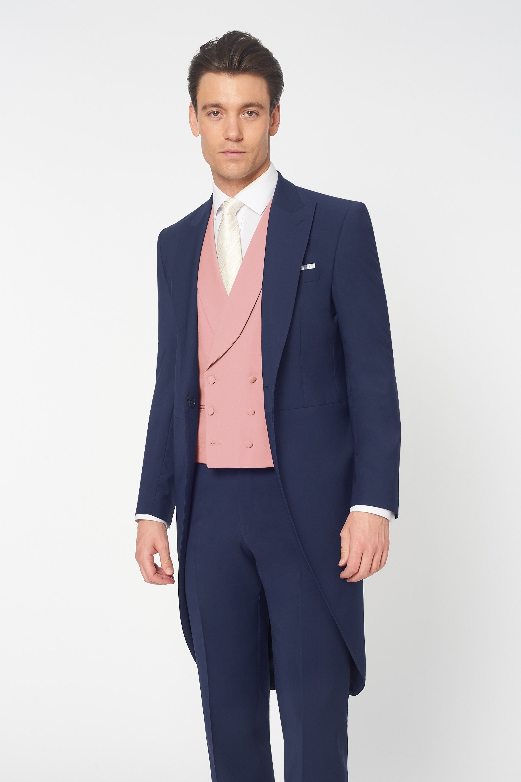 The Keadell Blue Slim fit tails with Pale Pink double breasted waistcoat - The classic tailcoat, re-cut for a more contemporary. Hire this tailcoat for timeless appeal but with a modern, lightweight take on a classic. A perfect rental for Ascot, weddings and everything in between. Chase or be chased in this ensemble, unless you're the groom of course. You've already won. Rathbones Tailor recommends going up 2 inches in trouser waist. A 32" waist should opt for a 34" waist.