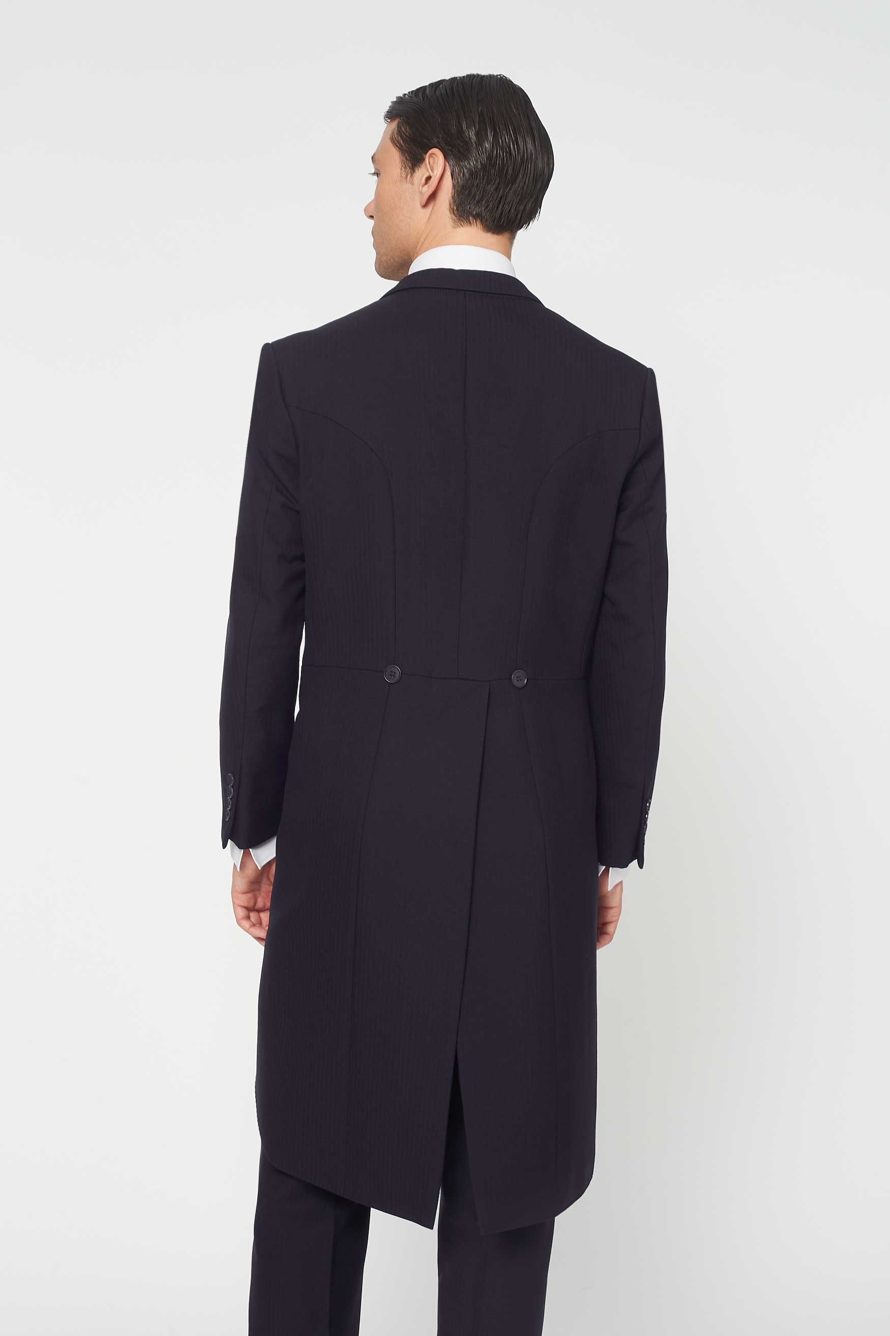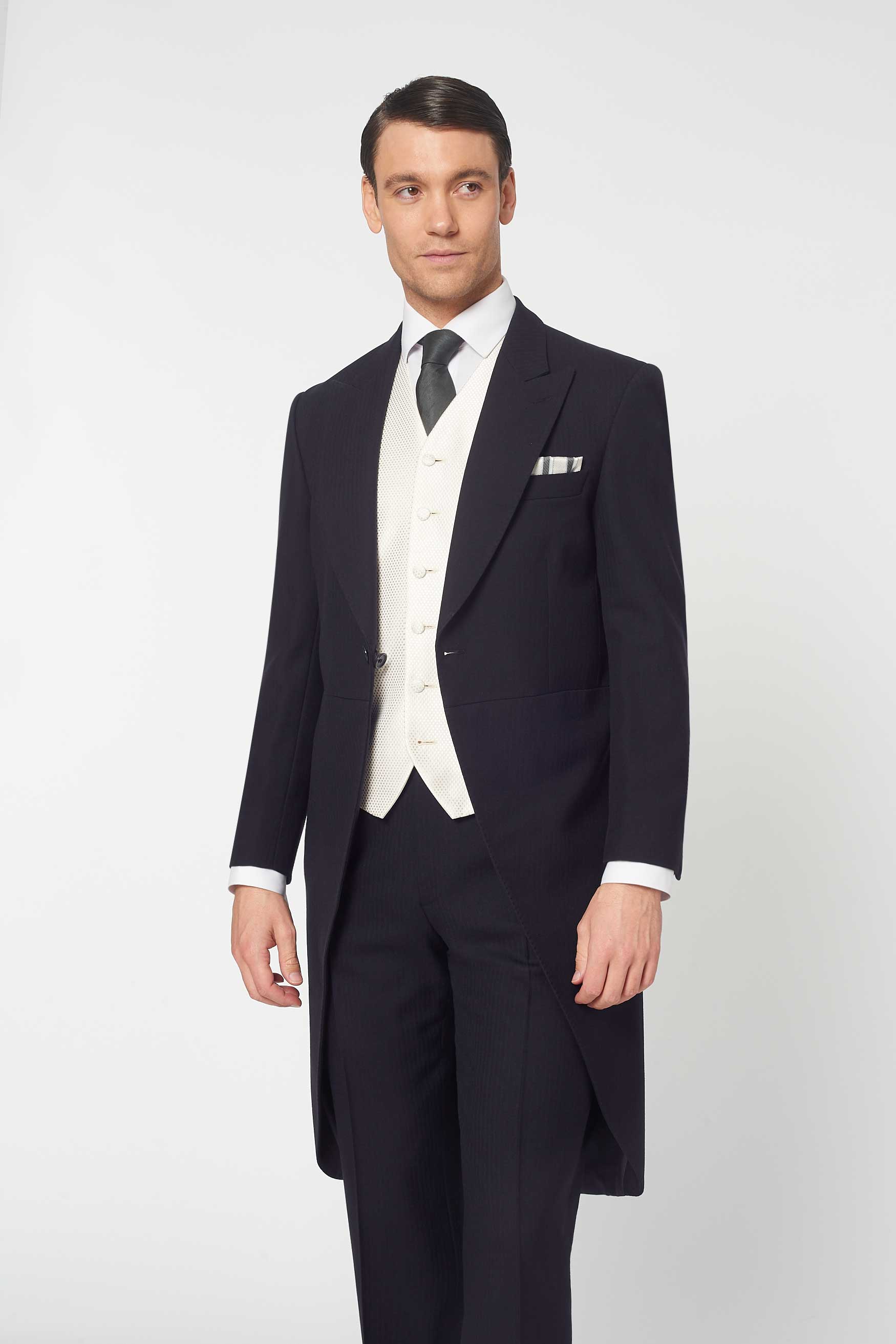 Hire The Bidwell 3 piece morning suit in Navy, pair it with the Ivory Dot waistcoat and never look back. All roads lead to looking the best at the party. Rathbones Tailor seal of approval right there. This 3 piece morning suit is the perfect rental for weddings, races, or just because you want to feel fabulous. Oh so fabulous. When people compliment you, a simple thank you will suffice. Trousers run true to size. We recommend dropping down a size for the jacket. Select between navy herringbone or navy pinstripe trouser.