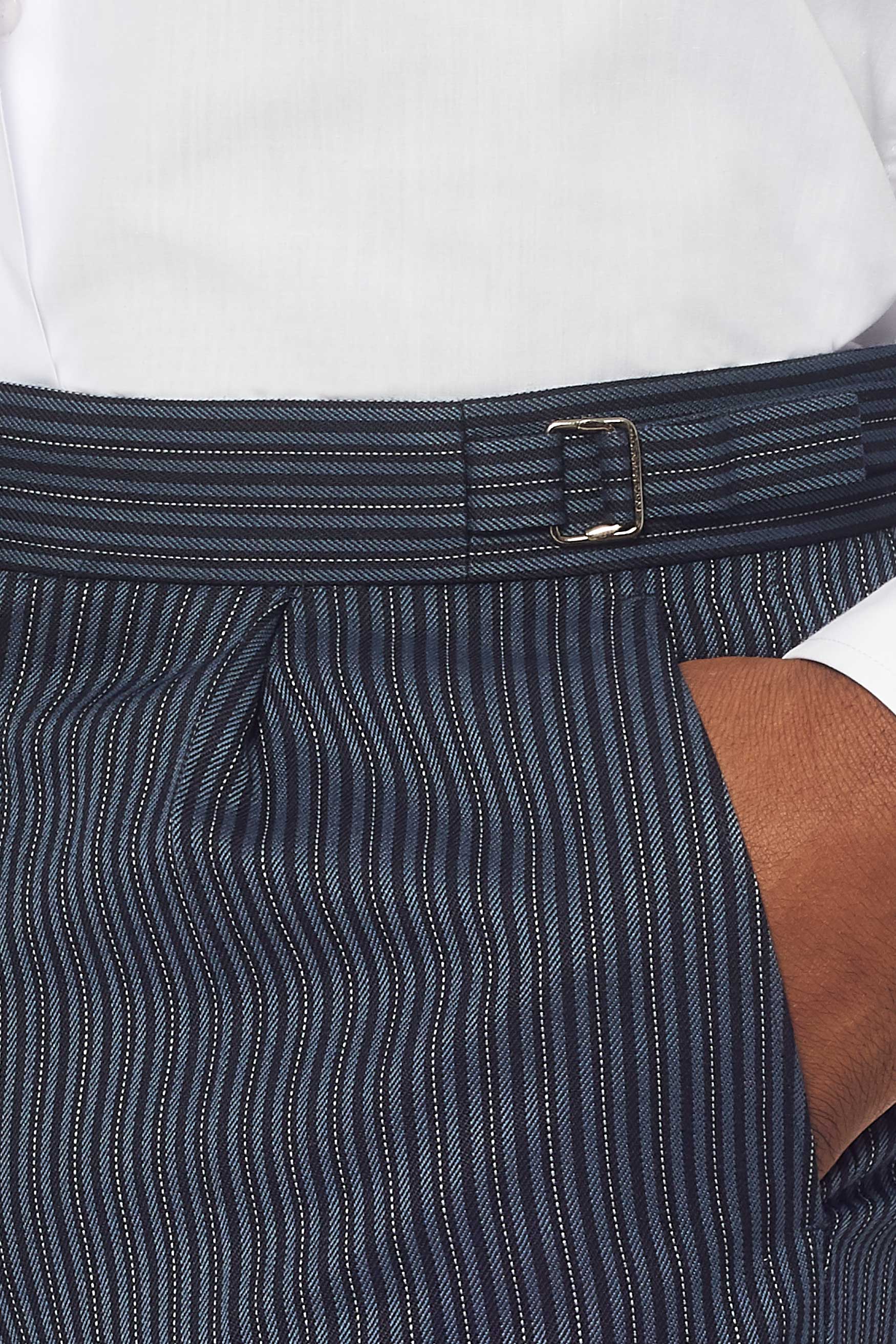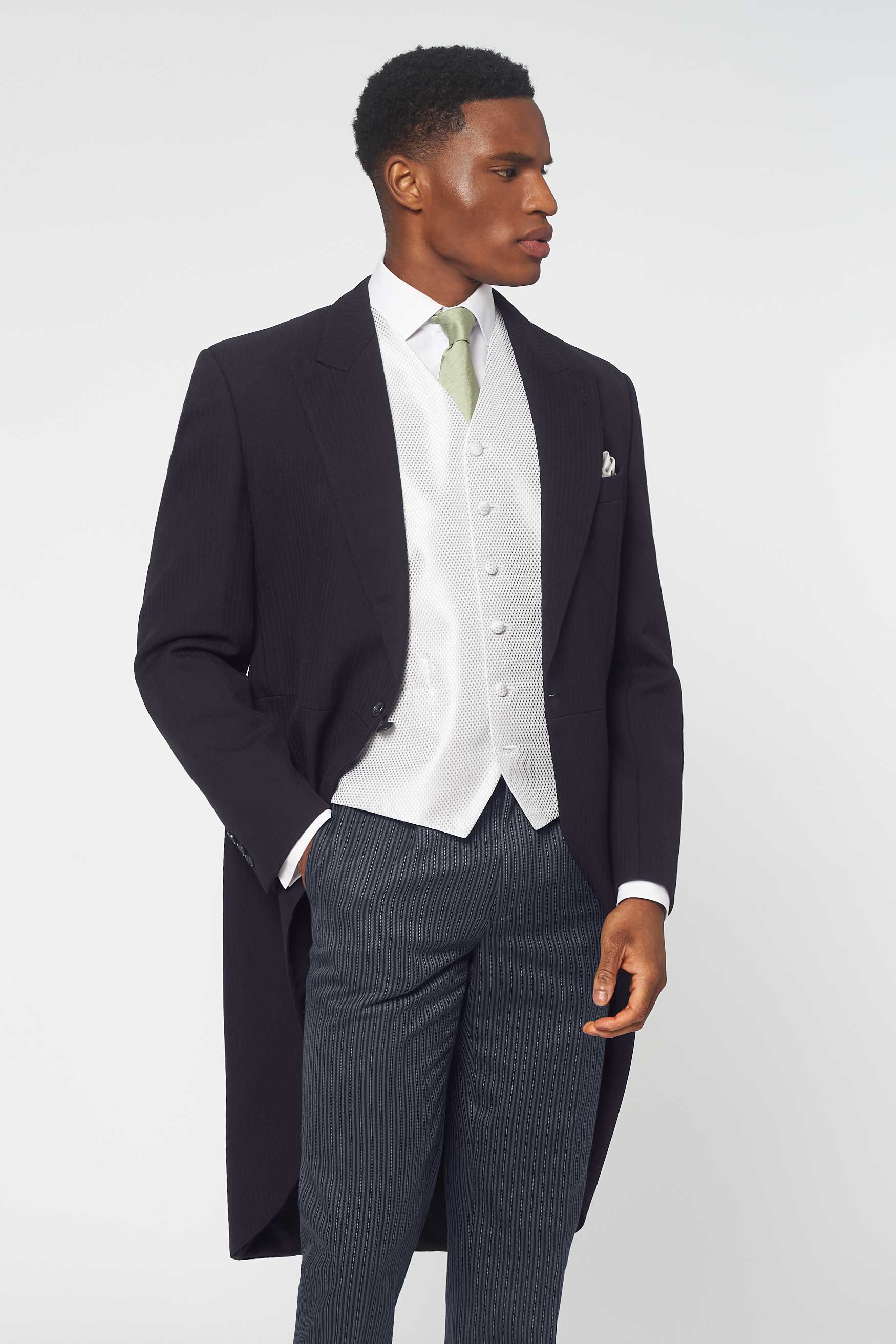 The Bidwell. A 3 piece morning suit. Here in Navy, paired with the Silver Dot waistcoat - Hire this classic tailcoat for a timeless look. This three piece morning suit is perfect to rent for weddings, ascot and other race events, or just because you feel fancy. Oh so fanshy. Are you good at receiving compliments? Well get good and quick. Trousers run true to size. For the jacket, we recommend dropping down one size. Select between navy herringbone or navy pinstripe trouser.