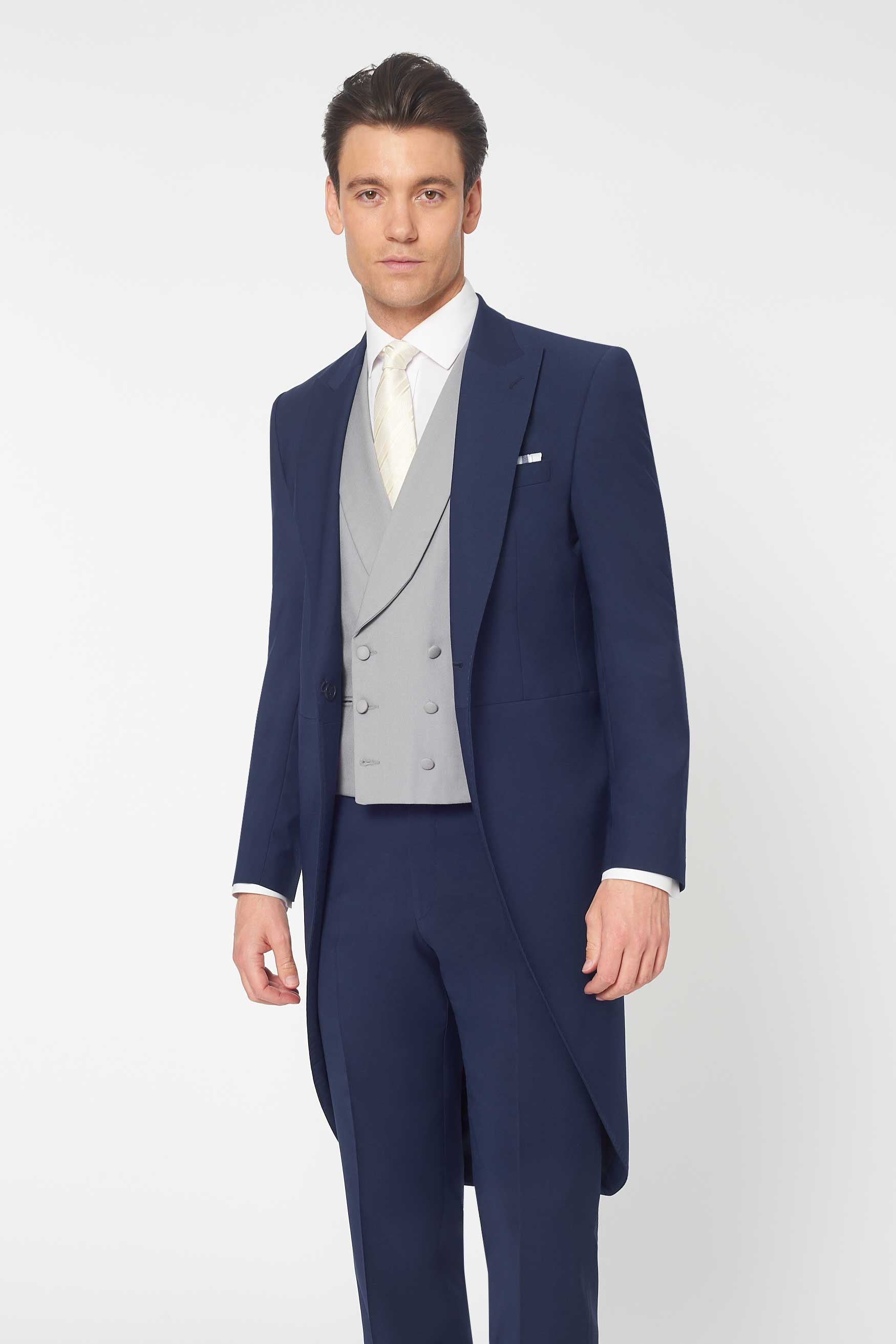 The Keadell Blue Slim fit morning suit with the St Albans double breasted grey waistcoat - The classic tailcoat, re-cut for a more slim-fit look. Hire this tailcoat for timeless appeal but with a modern, lightweight edge. A perfect rental for Ascot, weddings and everything in between. Chase or be chased in this ensemble, unless you're the groom of course. You've already won. Rathbones Tailor recommends going up 2 inches in trouser waist. A 32" waist should opt for a 34" waist.