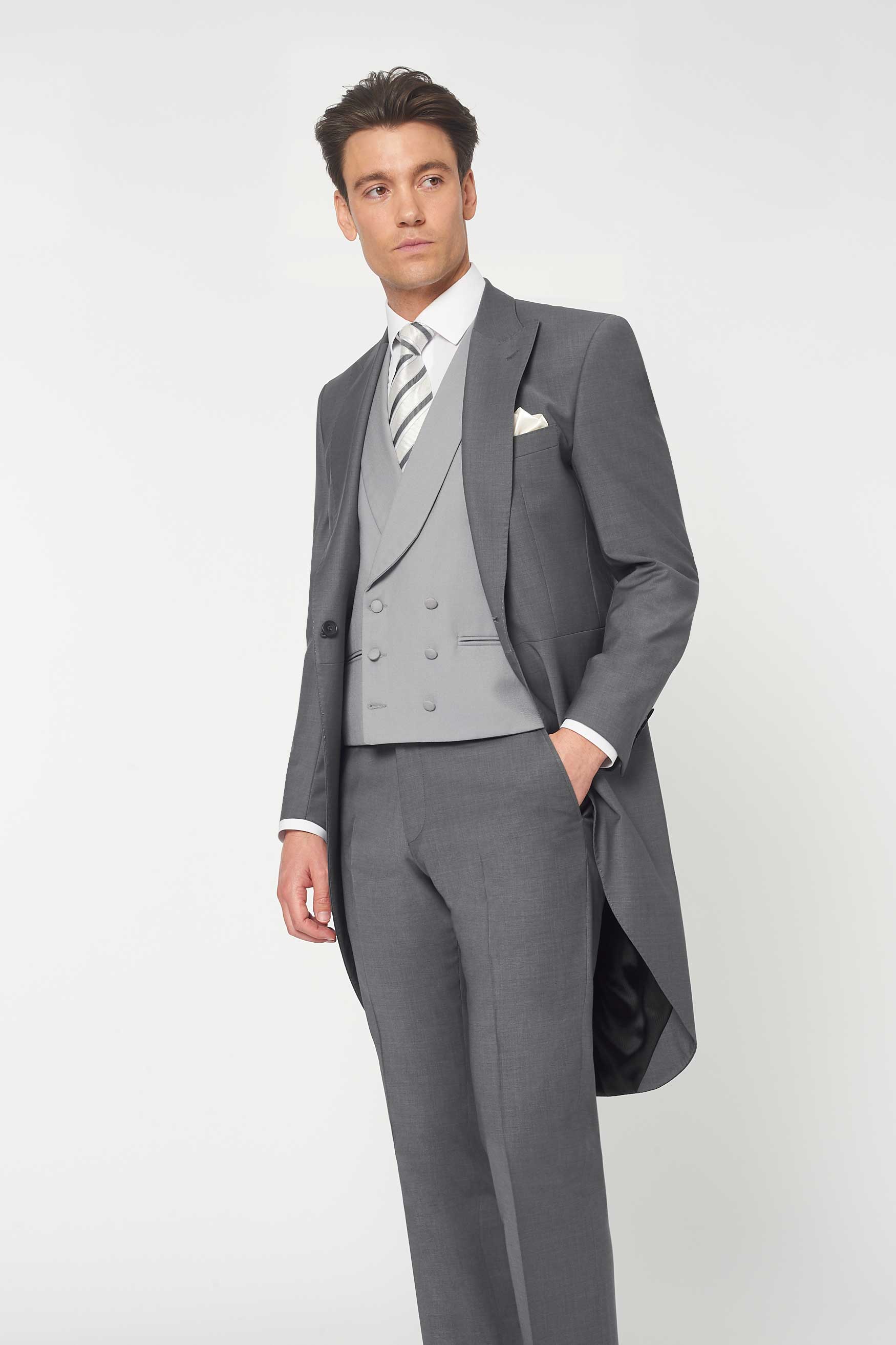 The Keadell Grey Slim fit tails with the Dove grey double breasted waistcoat - The classic tailcoat, re-cut for a more slim-fit look. Hire this tailcoat for timeless appeal but with a modern, lightweight edge. A perfect rental for Ascot, weddings and everything in between. Chase or be chased in this ensemble, unless you're the groom of course. You've already won. Rathbones Tailor recommends going up 2 inches in trouser waist. A 32" waist should opt for a 34" waist.