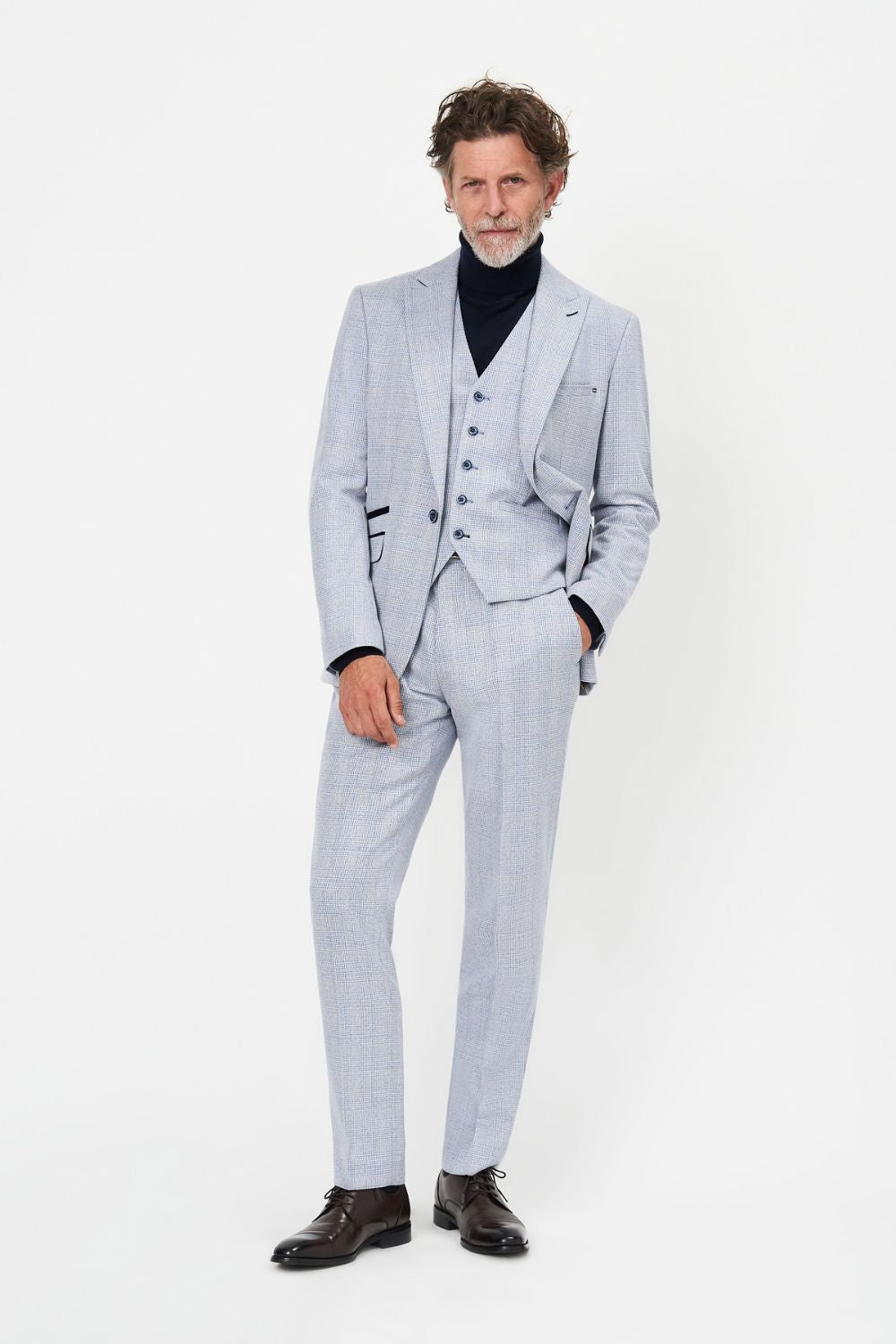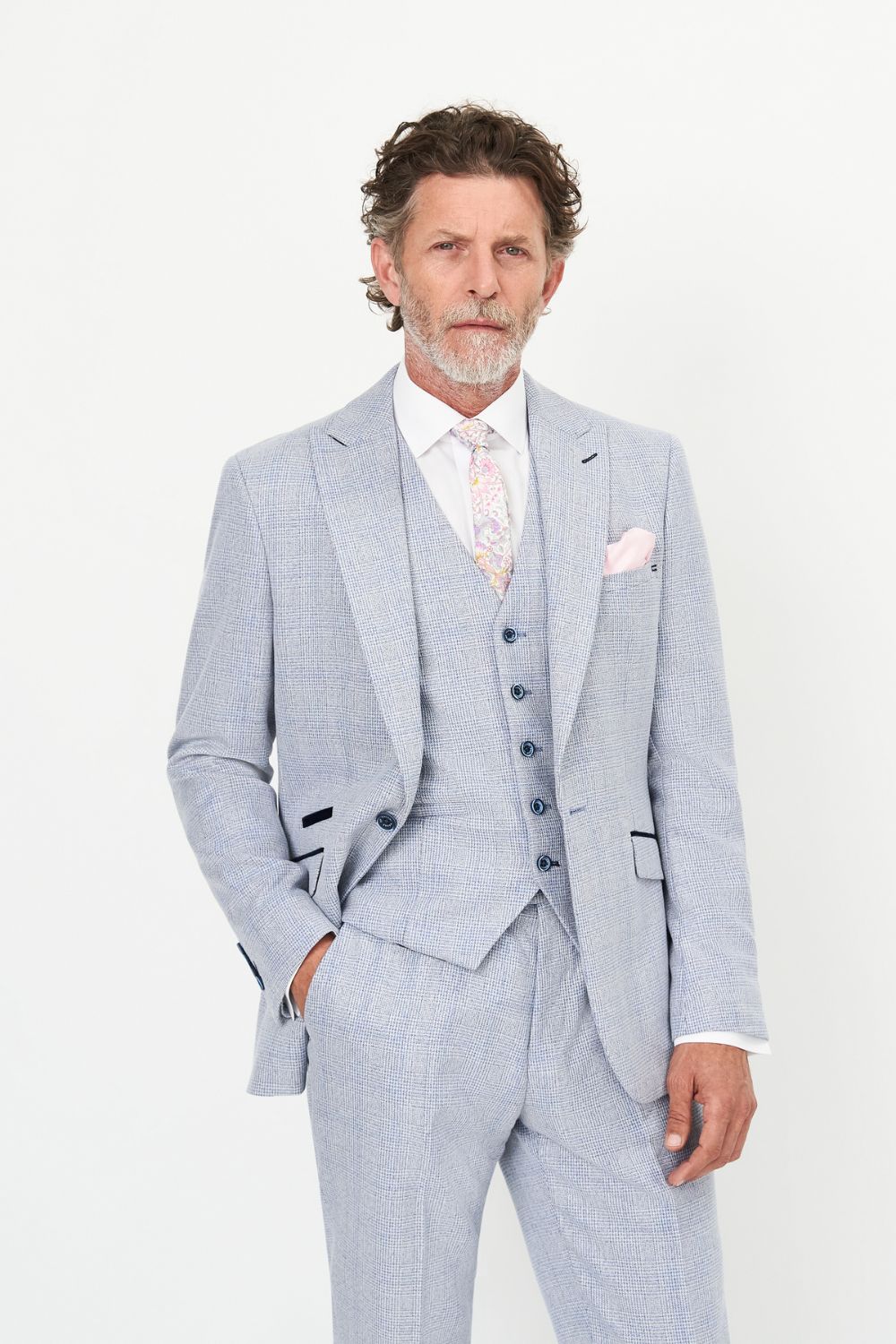 The Wheeler, our newest addition to the Rathbones Tailor hire range. A slick looking slim fit option in sky blue. It looks equally at home on the razzle dazzle as it does at a wedding (also razzle & dazzle). We've paired it with a clean black leather shoe, or dressed down with a roll neck for a festive killer look. Seen here in a three piece, it is also available as a full three piece with matching waistcoat. Guaranteed to turn heads. Up to you if you spread the word of Rathbones Tailor or keep us your own little secret!