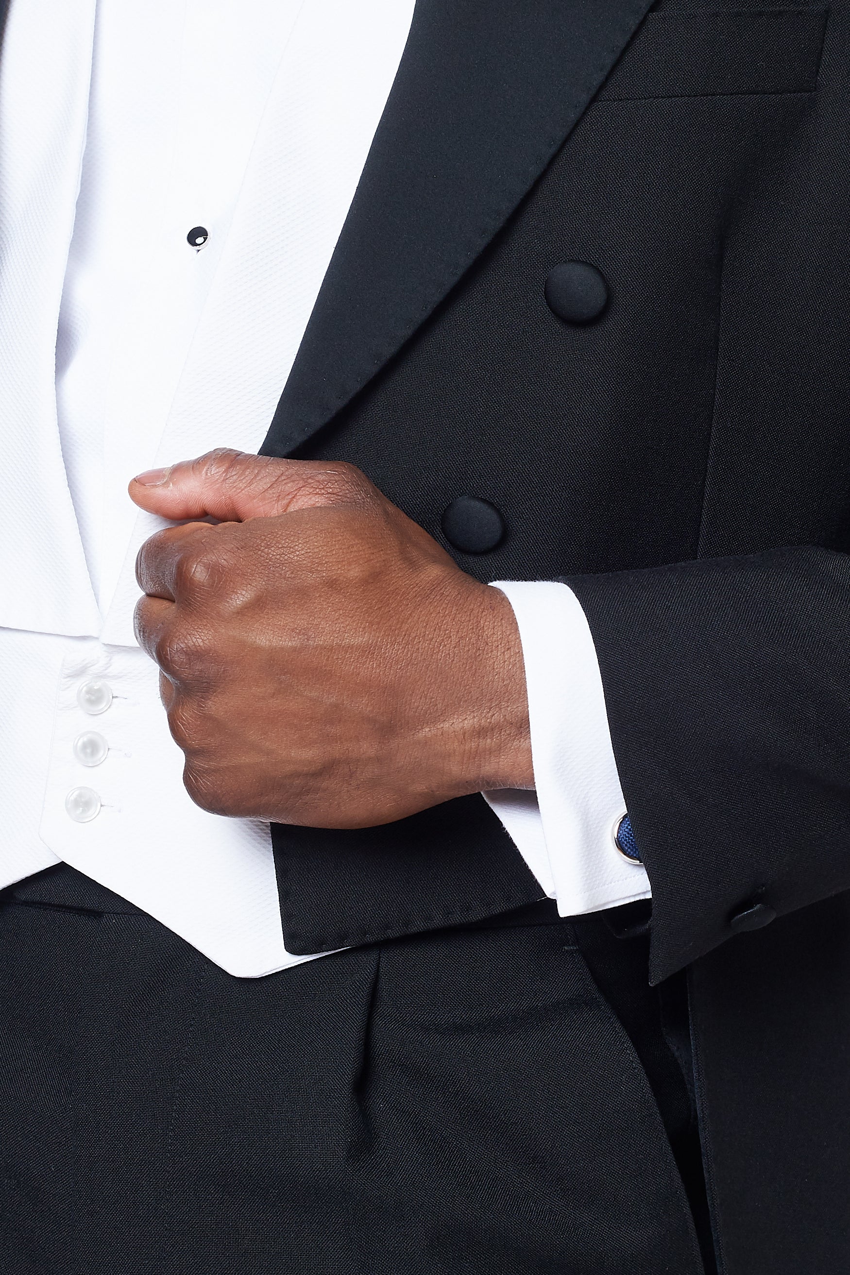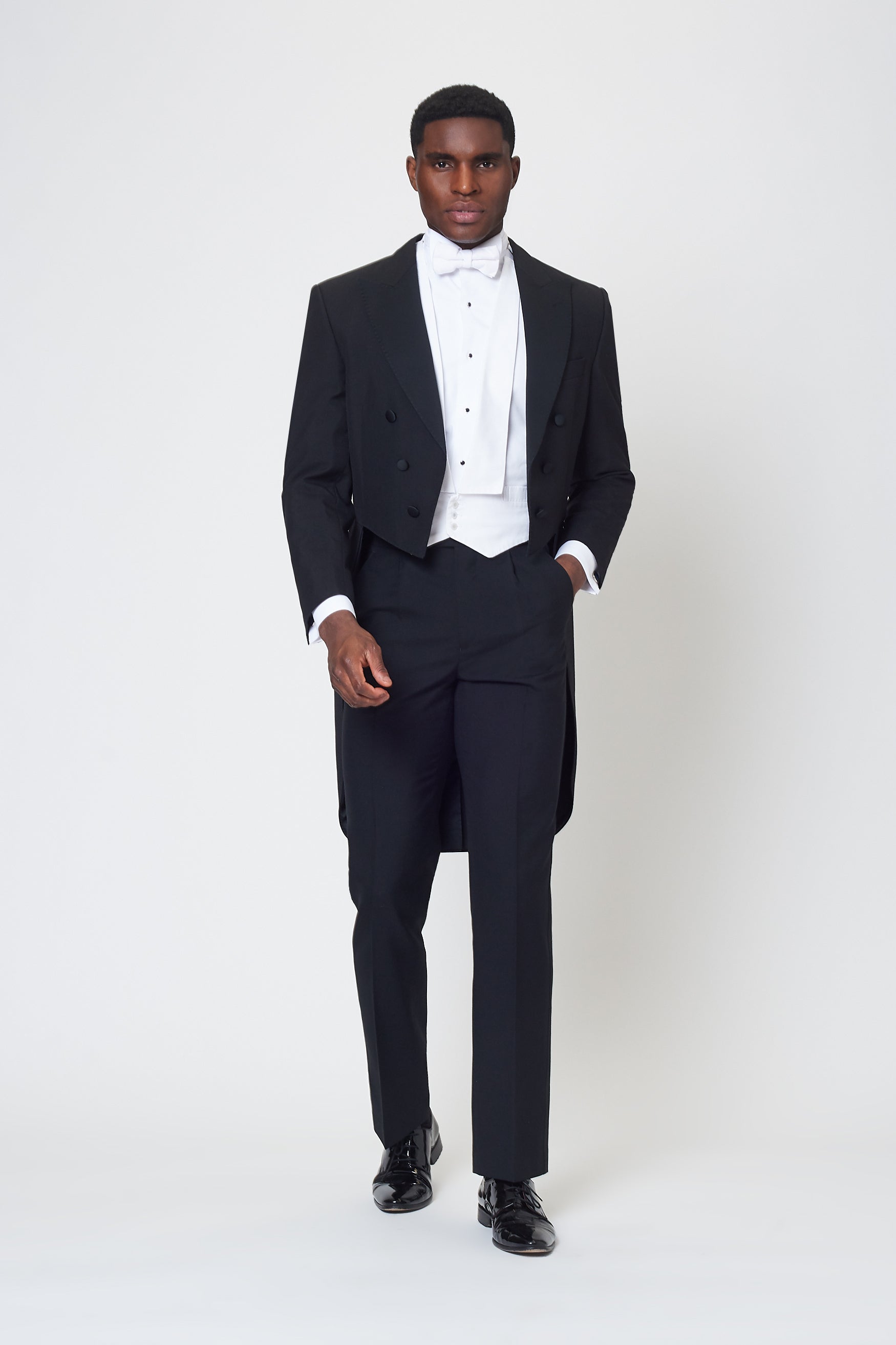 The ultimate in evening dress code, the white tie. Here we have the tailcoat and trousers in a 2 piece. Waistcoat, shirt, tie and hankie hired separately.