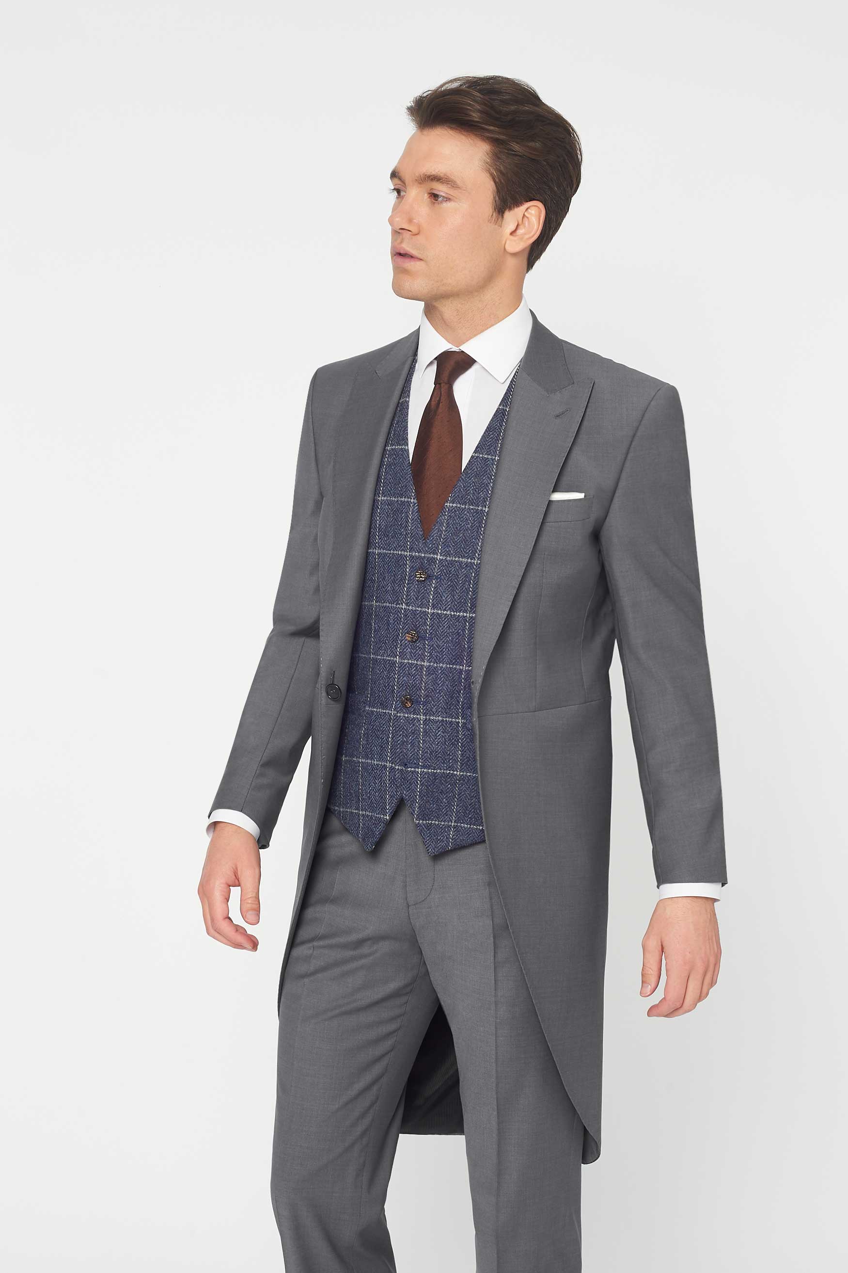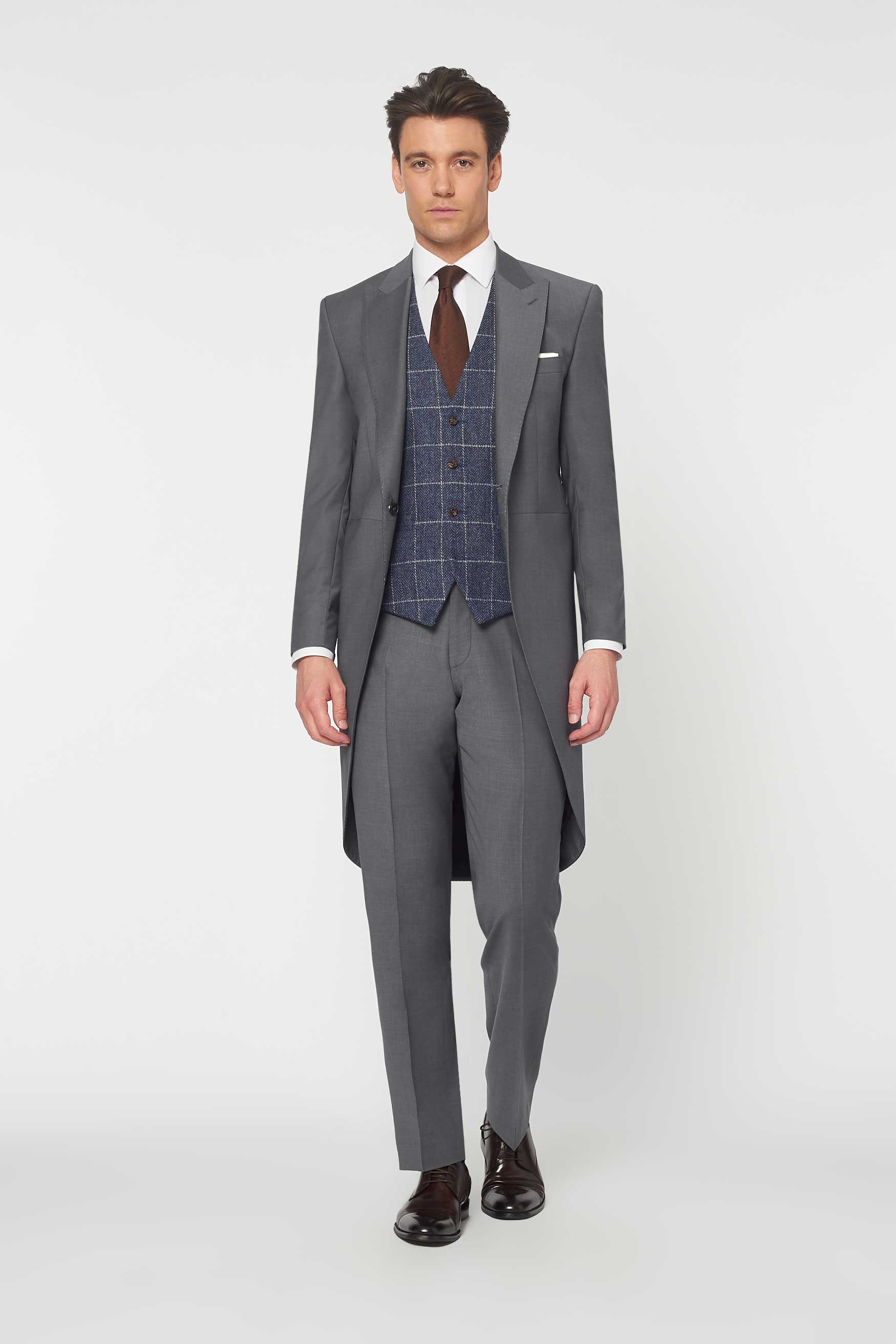 The Keadell Grey Slim fit tails with the Blue Tweed waistcoat - The classic tailcoat, re-cut for a more slim-fit look. Hire this three piece morning suit for timeless appeal but with a modern, lightweight edge. A perfect rental for Ascot, weddings and everything in between. Chase or be chased in this ensemble, unless you're the groom of course. You've already won. Rathbones Tailor recommends going up 2 inches in trouser waist. A 32" waist should opt for a 34" waist.