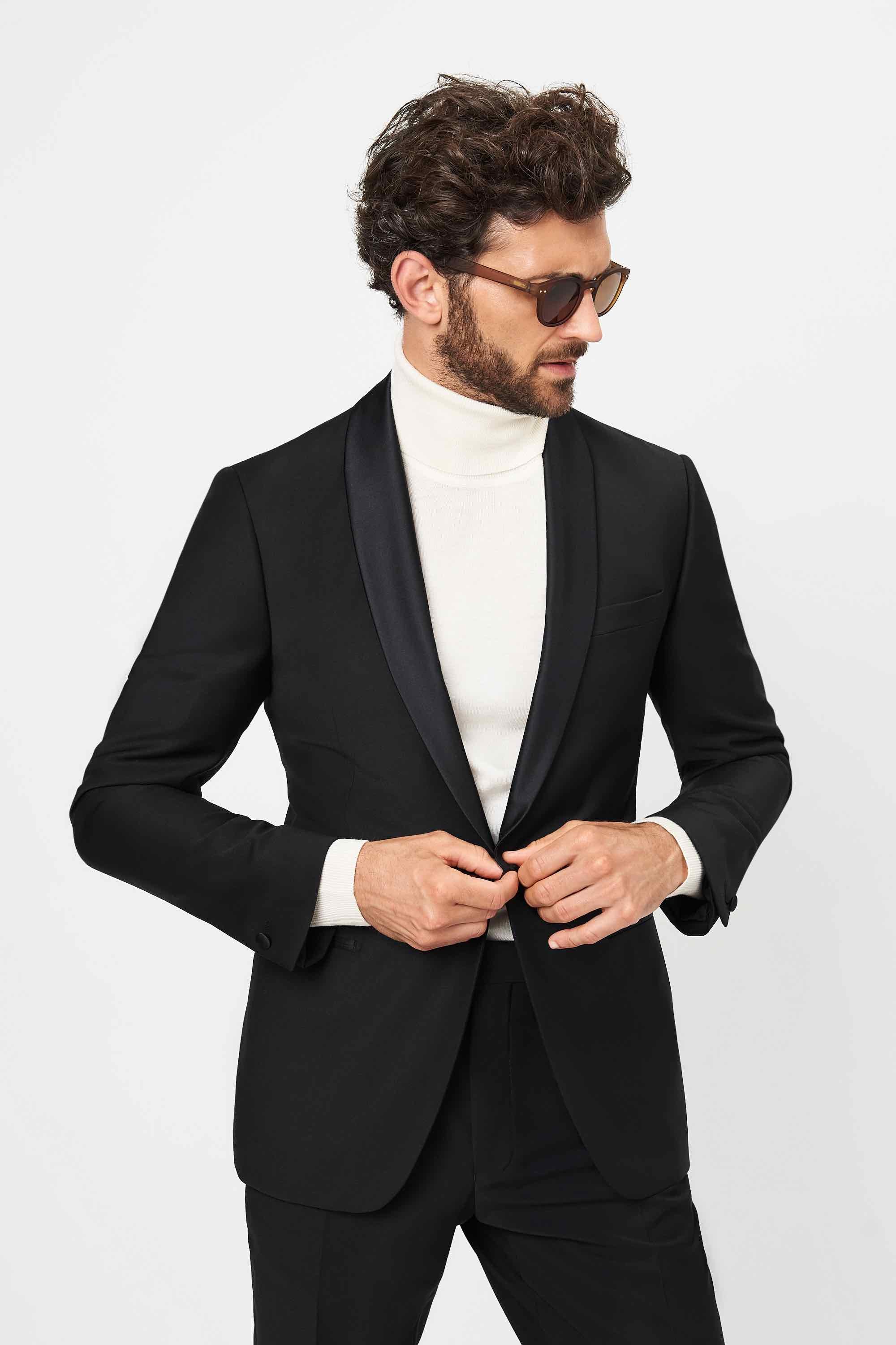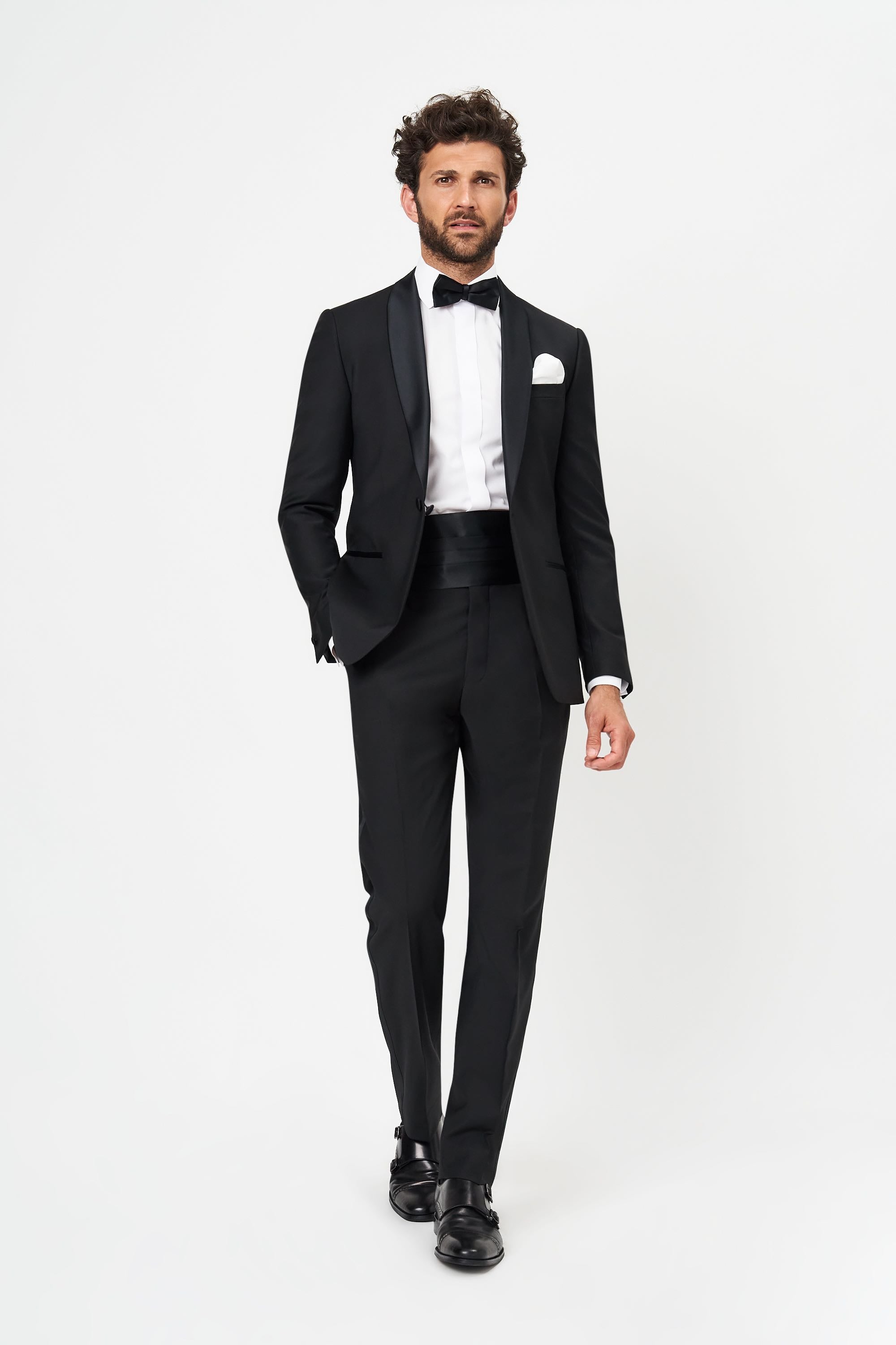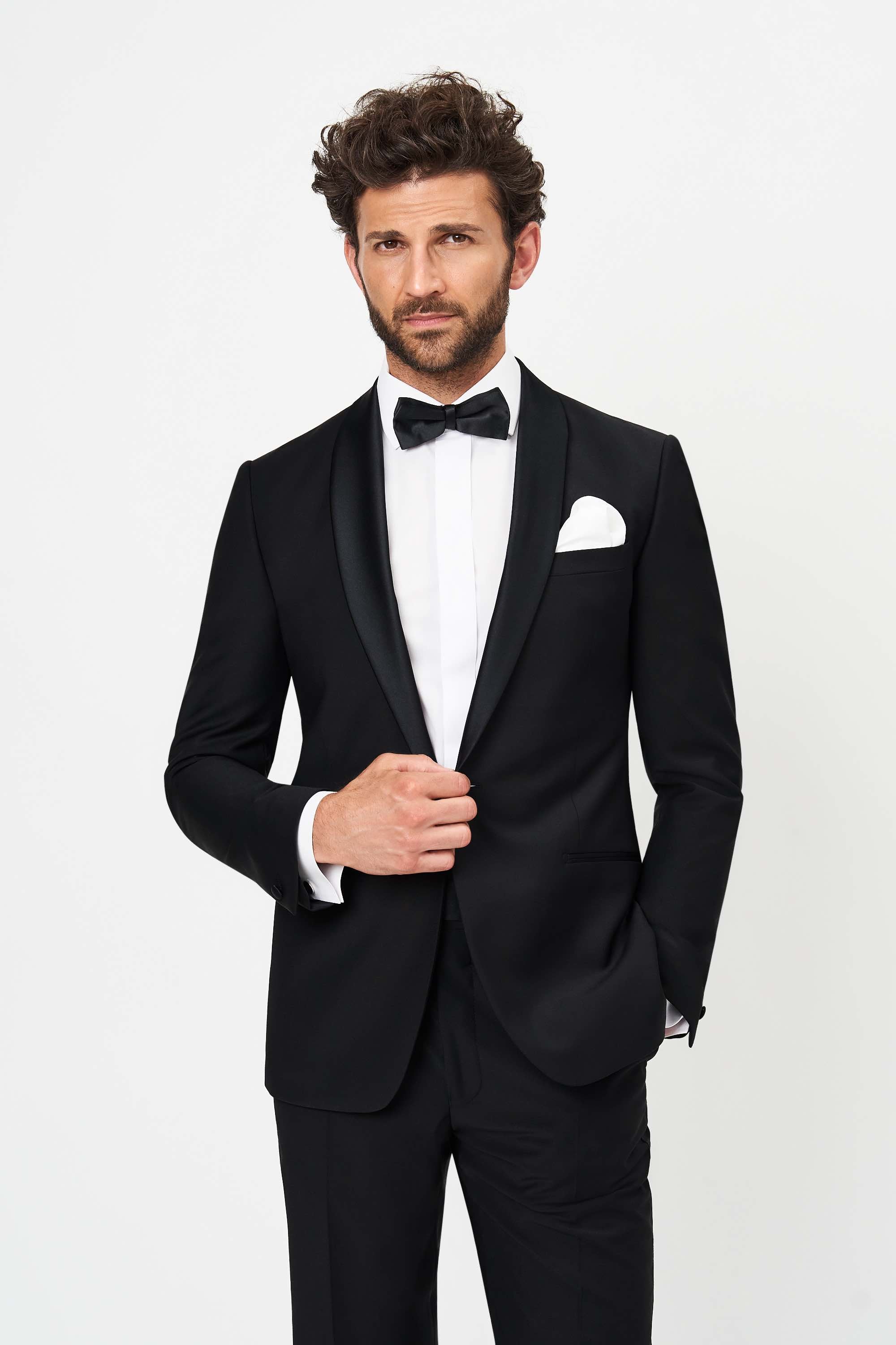 A slim fit black tuxedo with a shawl lapel... It must be 'The Thomas' slim fit tux from Rathbones Tailor. The newest addition to the black tie range, hire this 2-piece tuxedo from Rathbones Tailor to feel phenomenal at your next event. When you feel this good you can't help but look good. And we all know what happens when you look that good! Runs true to size. Make sure to hire from Rathbones Tailor 5 days in advance of your event.