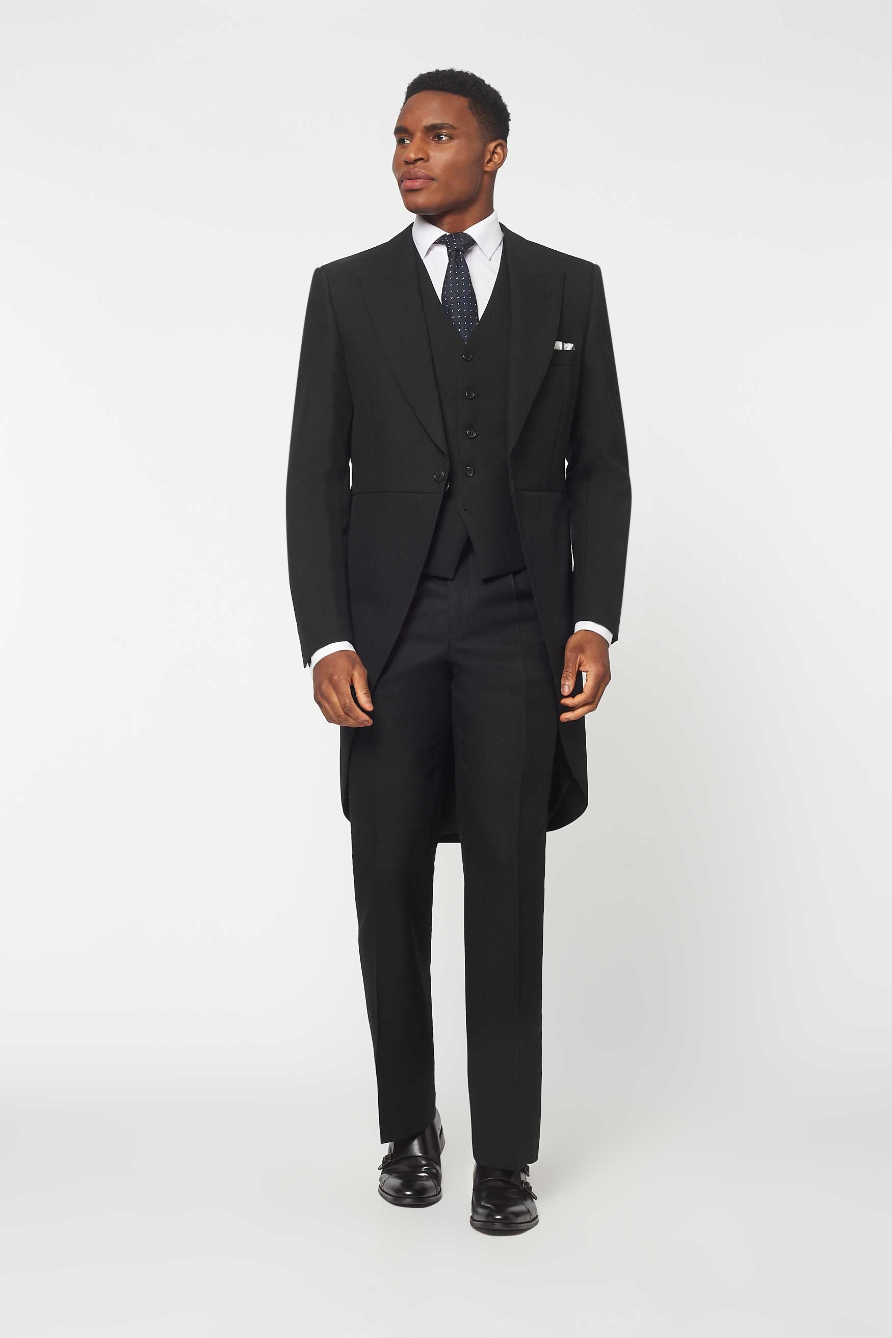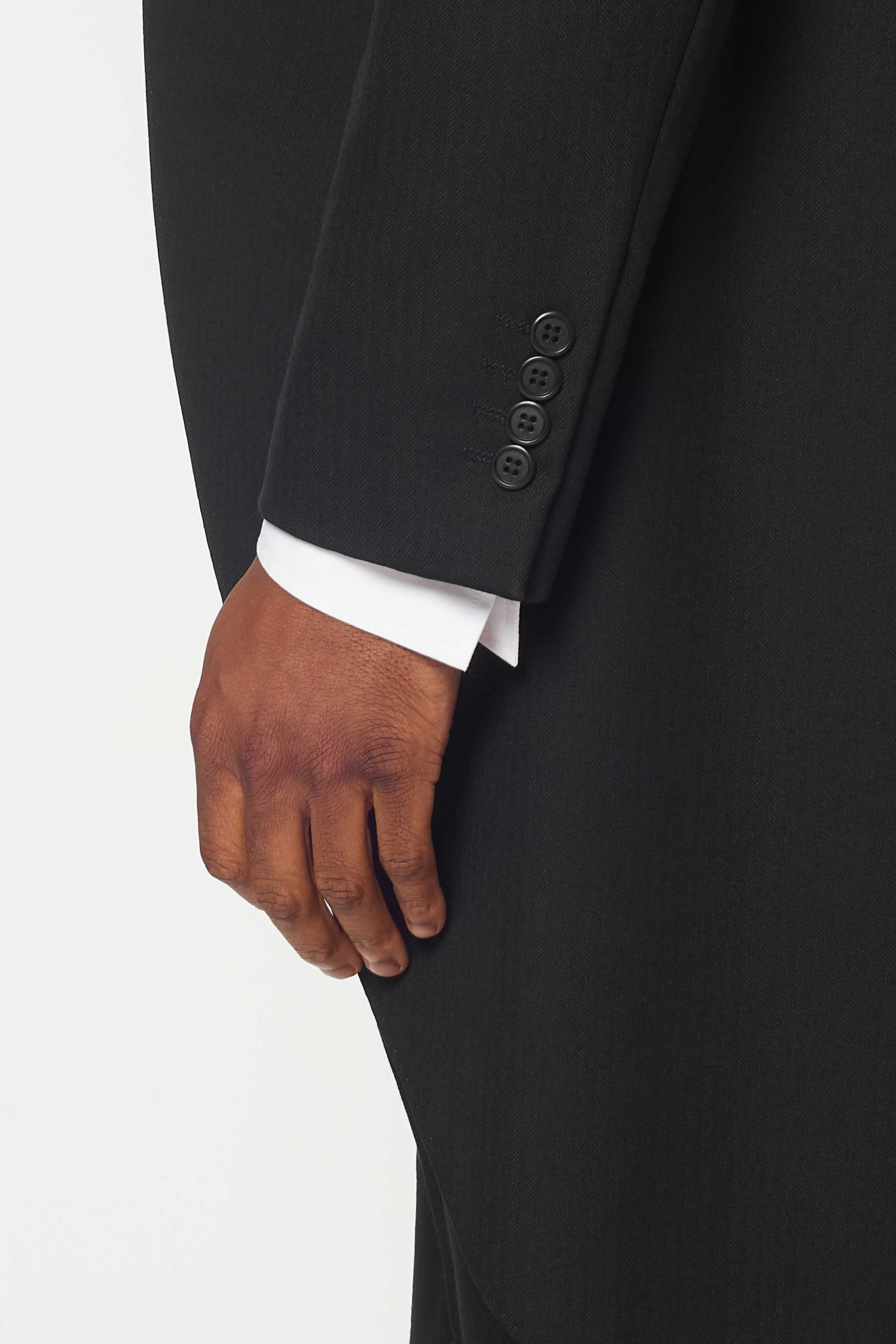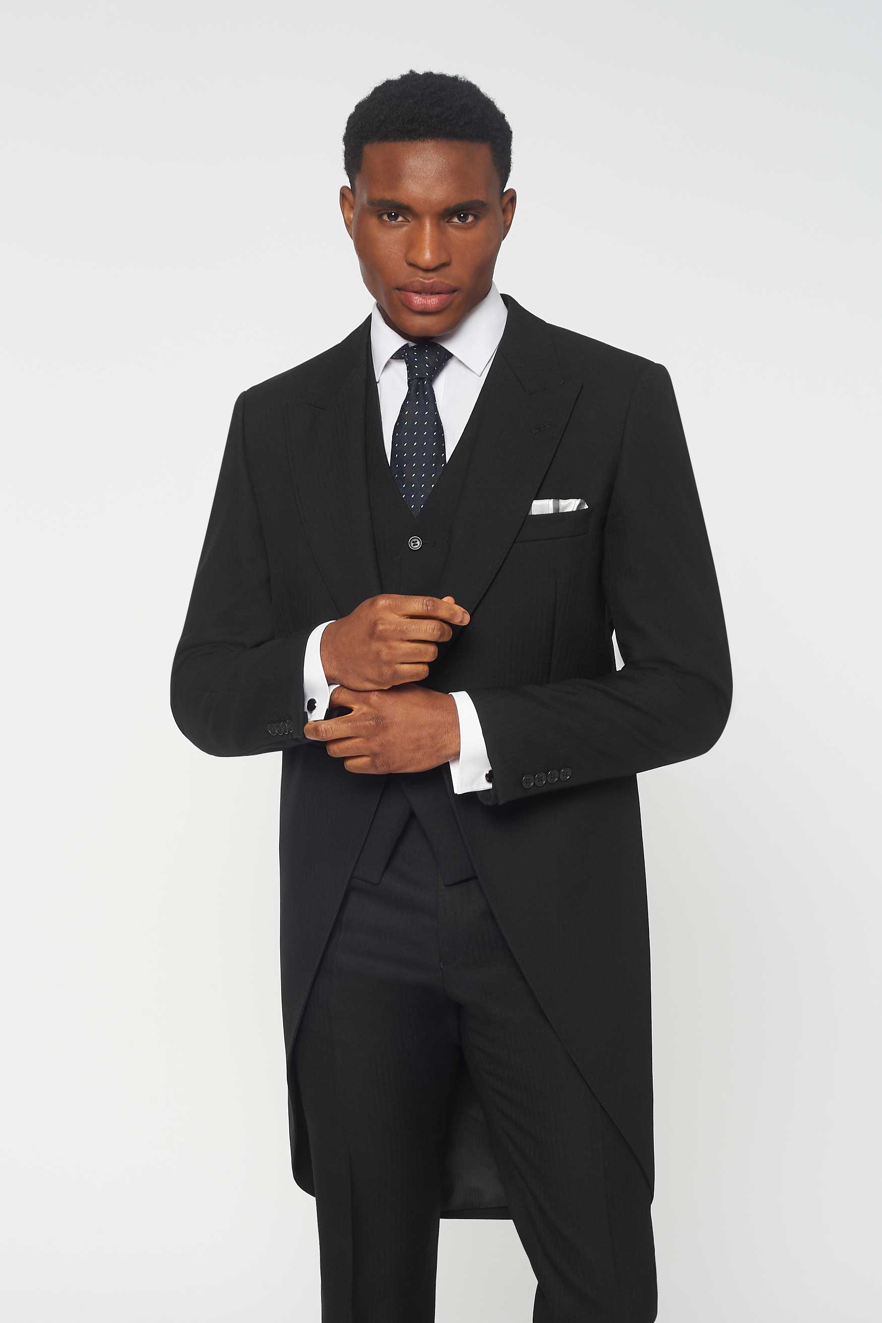 A two piece black morning suit to hire, for those who already own their waistcoat. Remember a morning suit is always worn as a 3-piece suit. Hire this classic morning suit from Rathbones Tailor with a regular cut trouser. Hire this 2 piece morning suit for wedding parties, ascot races and other race events. Proper fancy. Runs true to size. If between jacket sizes, we recommend dropping down. Select either Black Herringbone or Grey Pinstripe trousers.