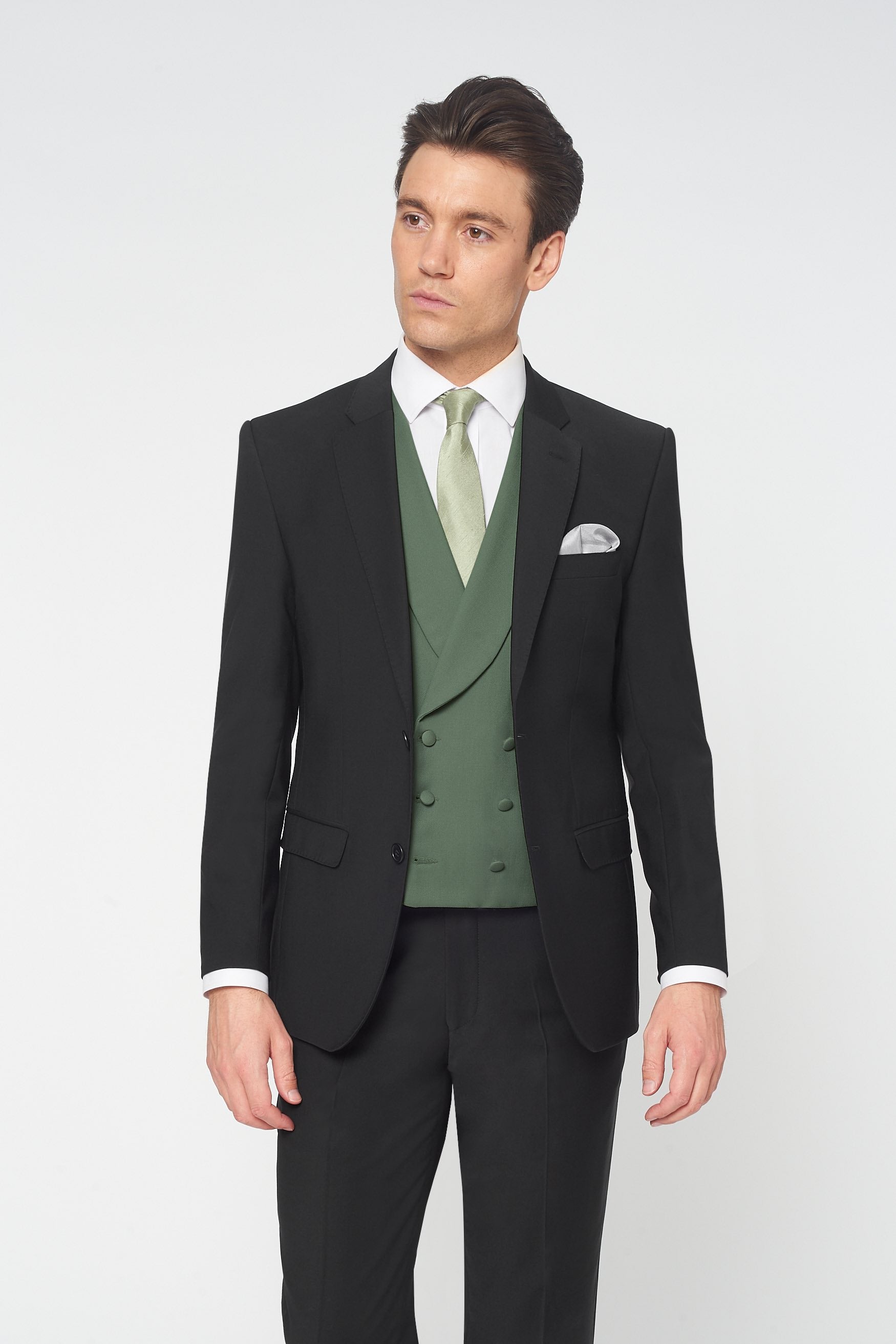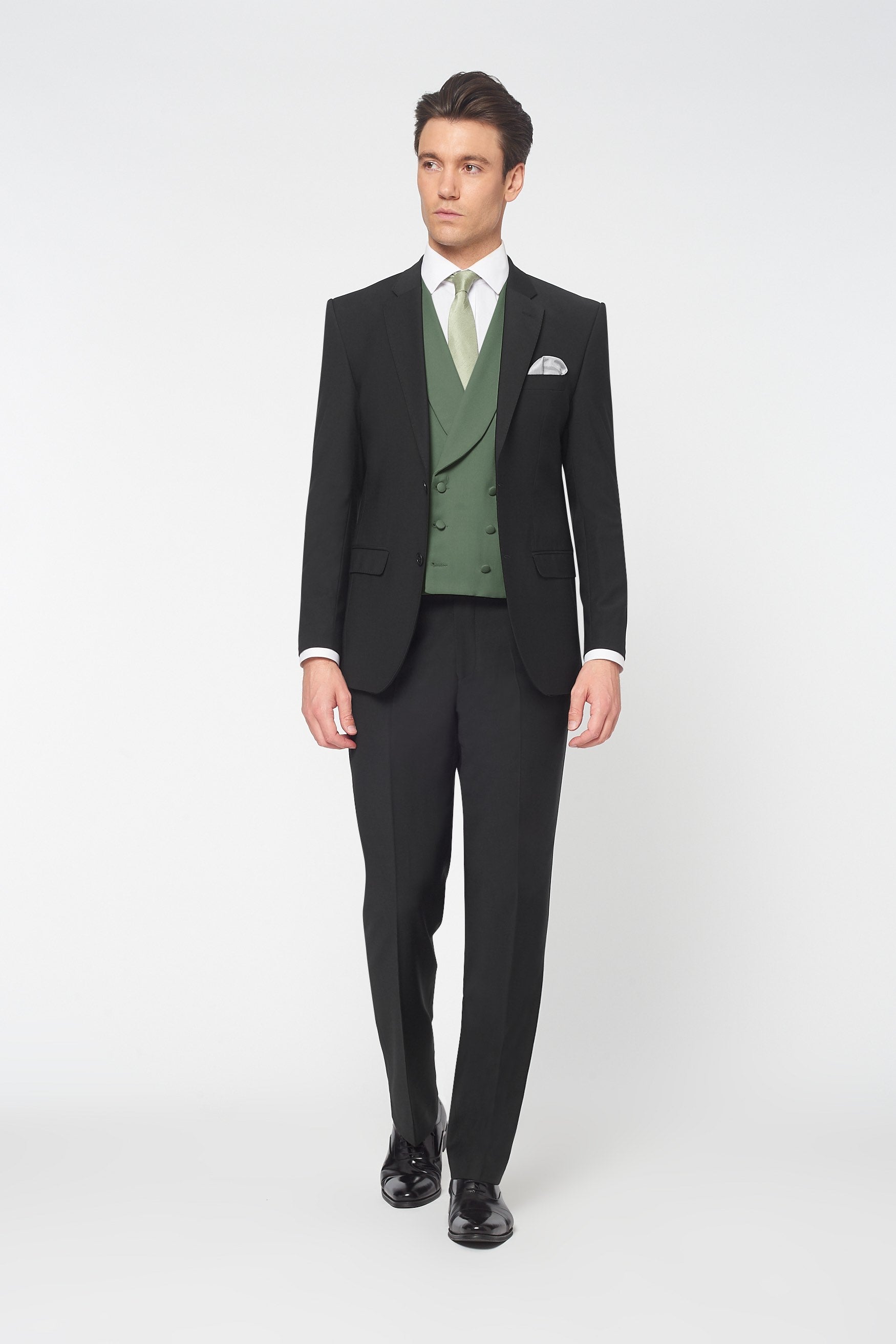 The Simkins - 3 Piece Black Slim Fit Suit | Deep Green Double Breasted Waistcoat