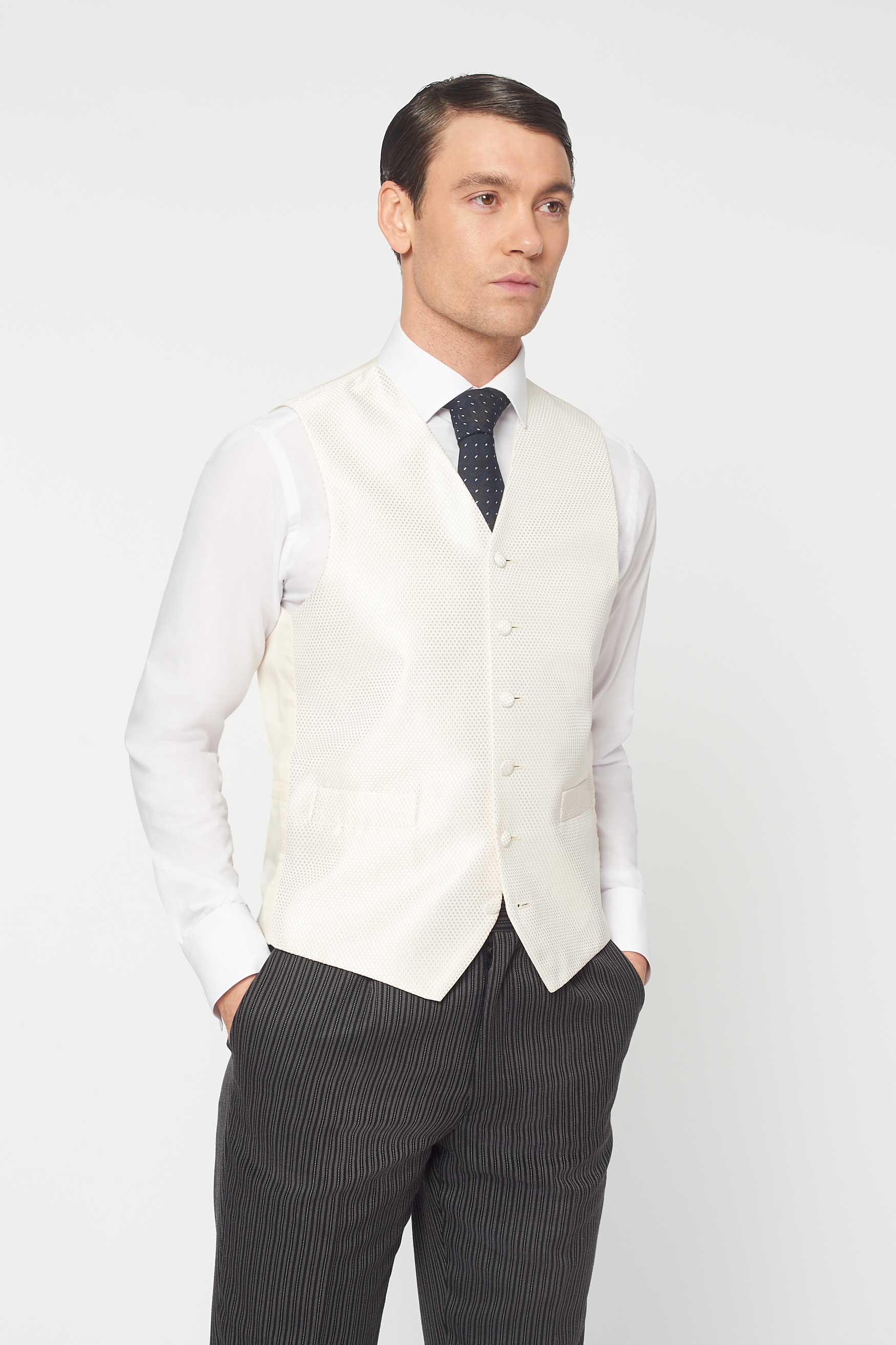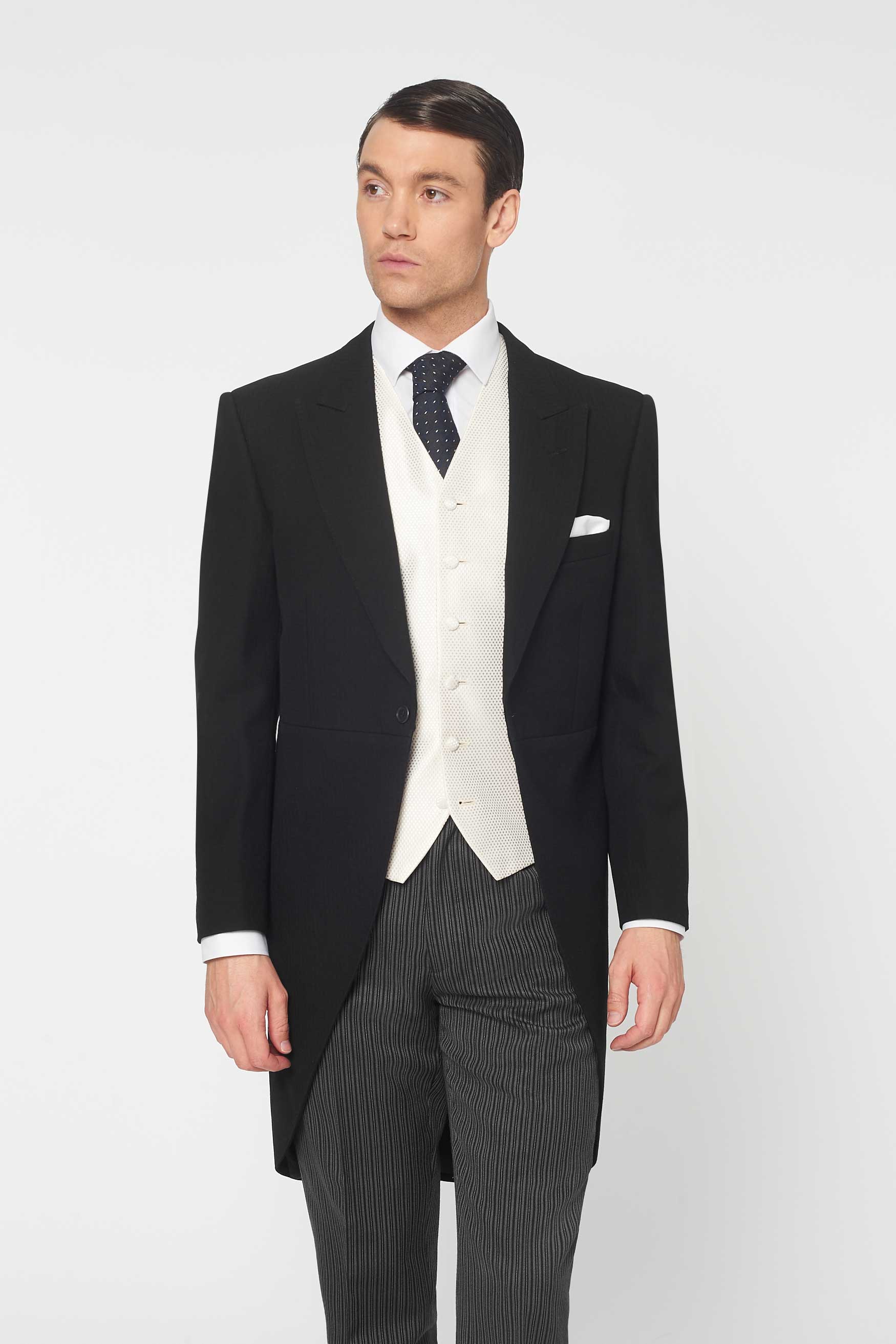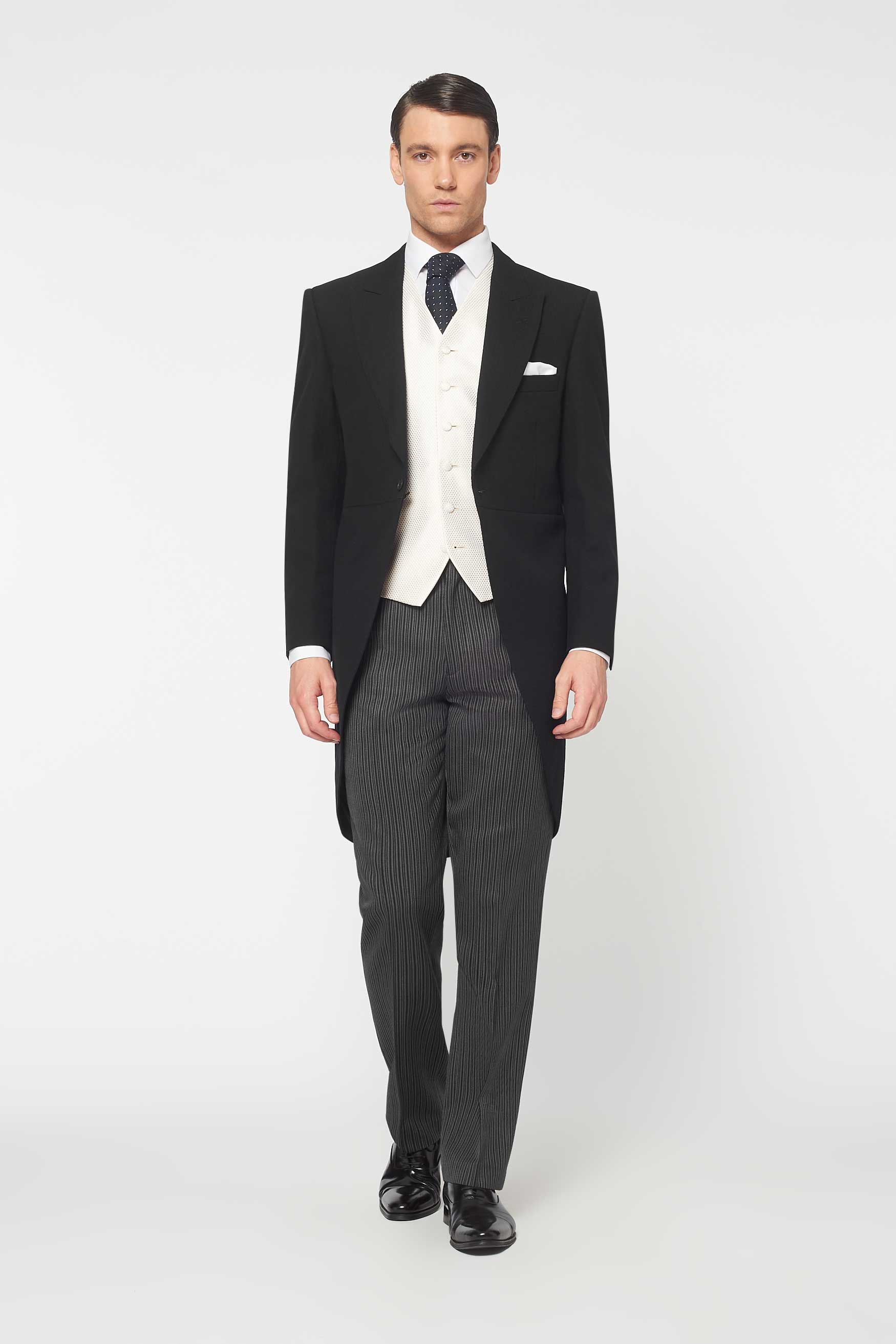 Looking for a 3 piece Morning suit to hire, it's got to be The Bidwell in Black Herringbone. Paired here with the Ivory Dot waistcoat - A regular fit for a timeless cut. The Bidwell is perfect to rent for wedding parties, ascot and other race events, or just because you feel fancy. Proper fancy. The trouser has a straight leg for a classic formal look. Select either Black Herringbone or Grey Pinstripe trousers.