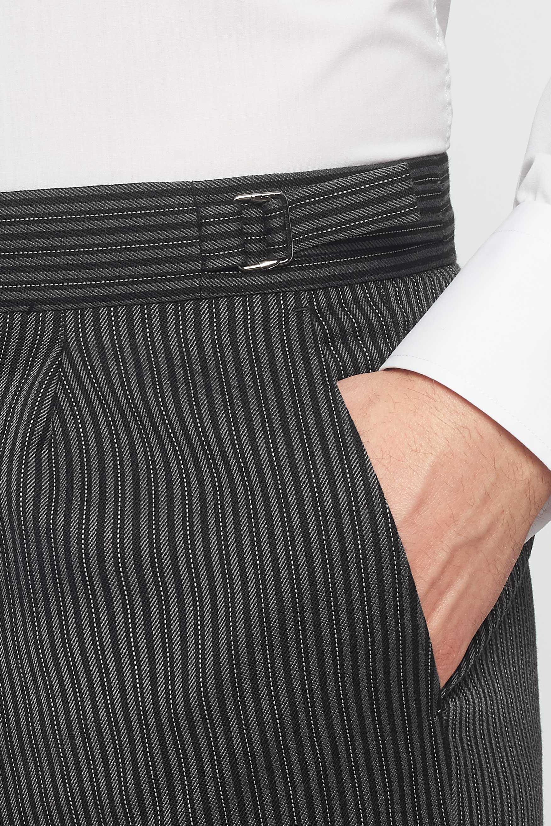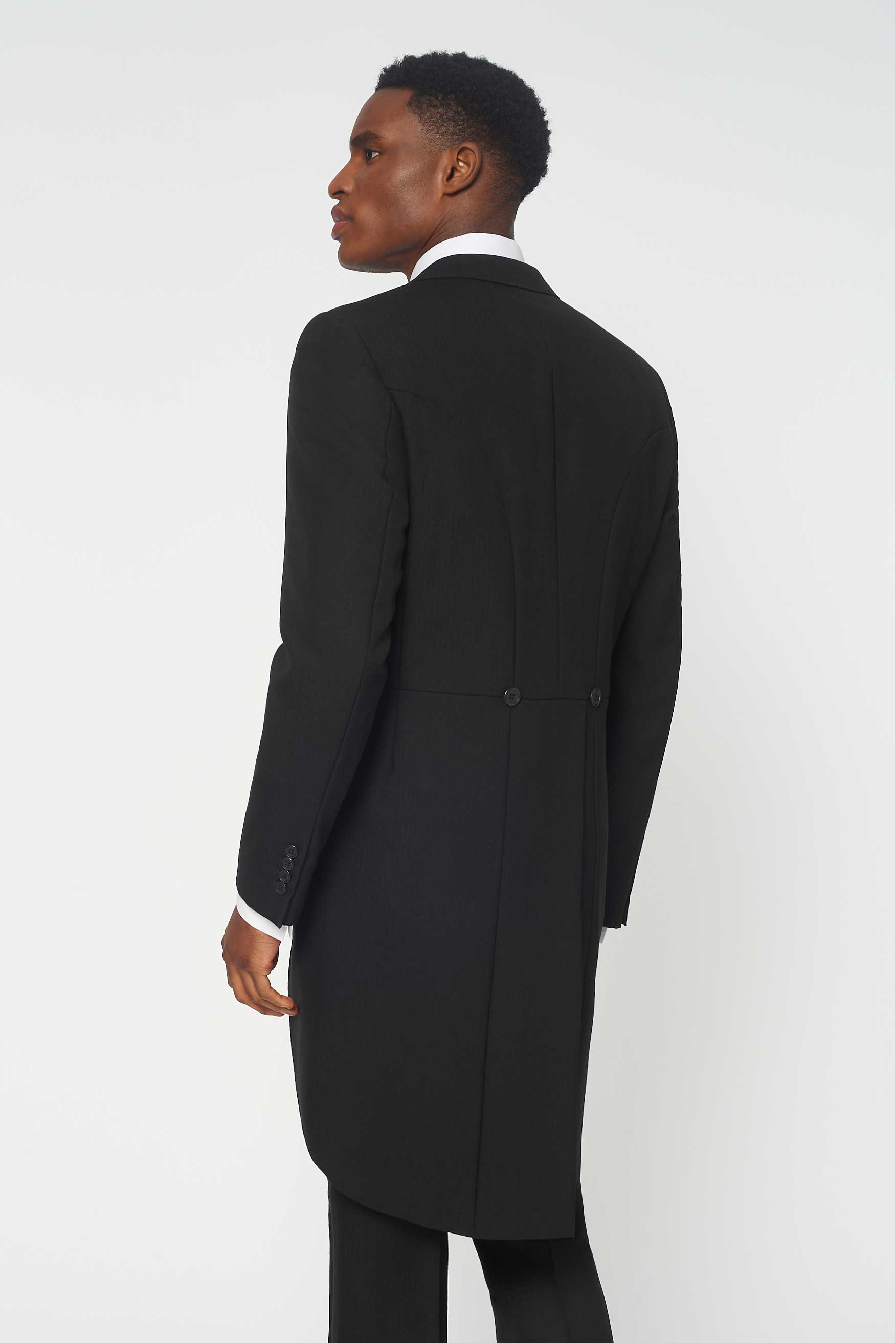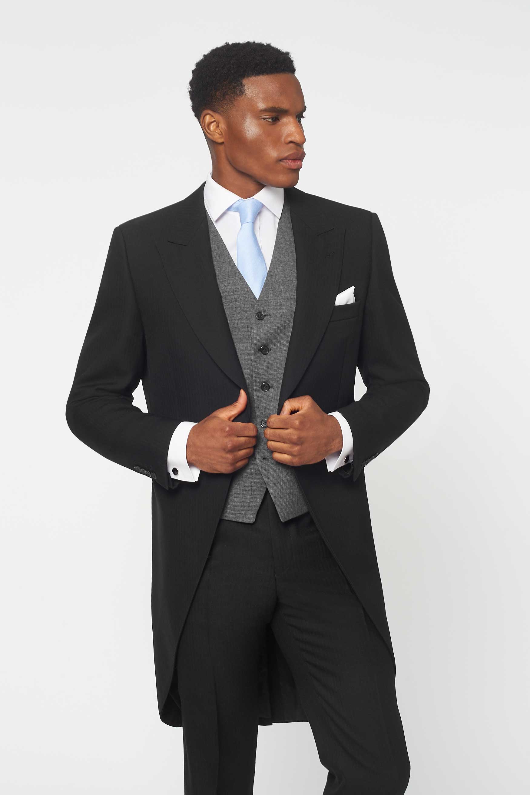 The Bidwell 3 Piece Black Herringbone morning suit paired with the Mid Grey waistcoat - The Bidwell is perfect to rent for wedding parties, ascot and other race events, or just because you feel fancy. Proper fancy. Hire this classic tailcoat from Rathbones Tailor for a timeless look. Runs true to size. If between jacket sizes, we recommend dropping down. Select either Black Herringbone or Grey Pinstripe trousers.