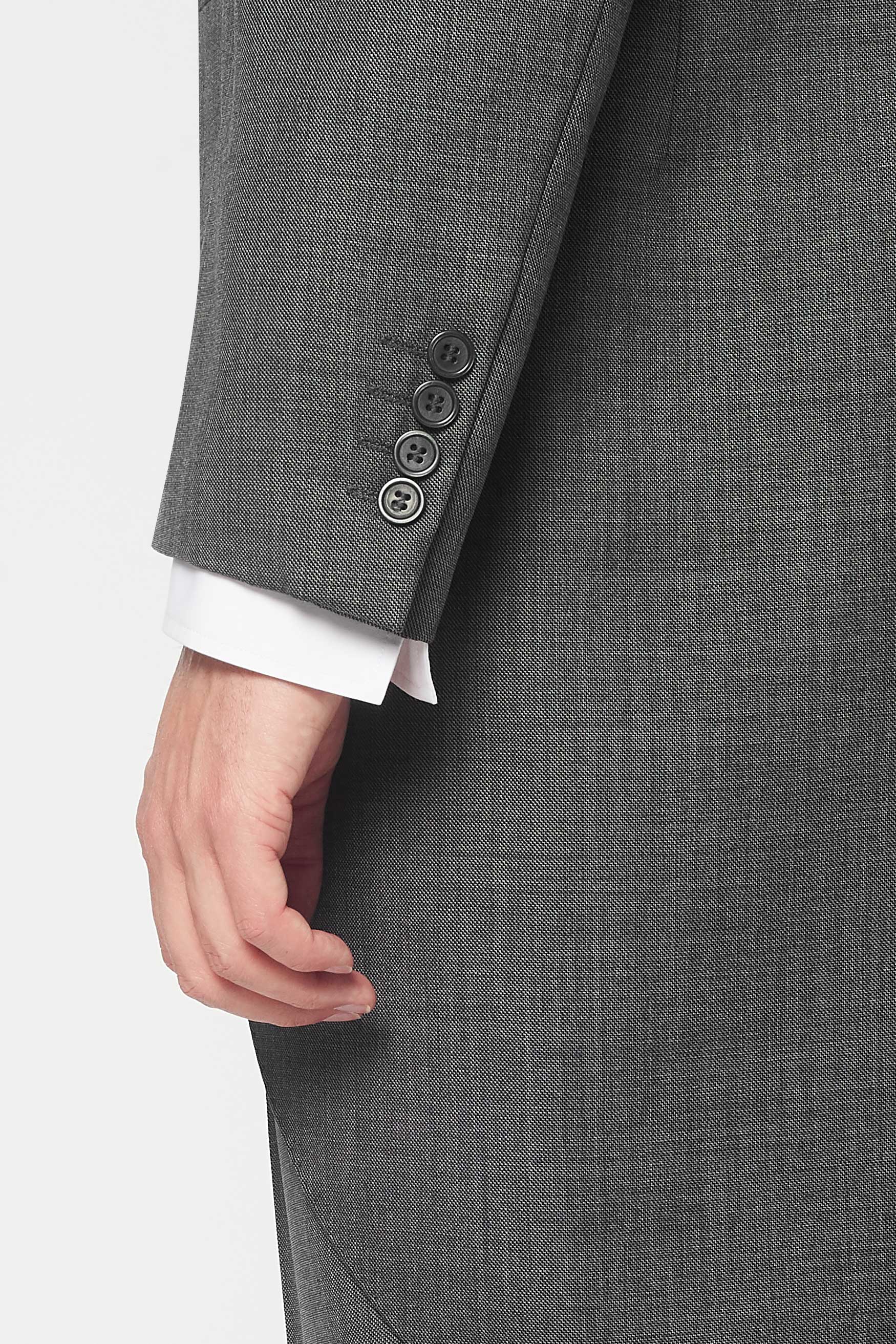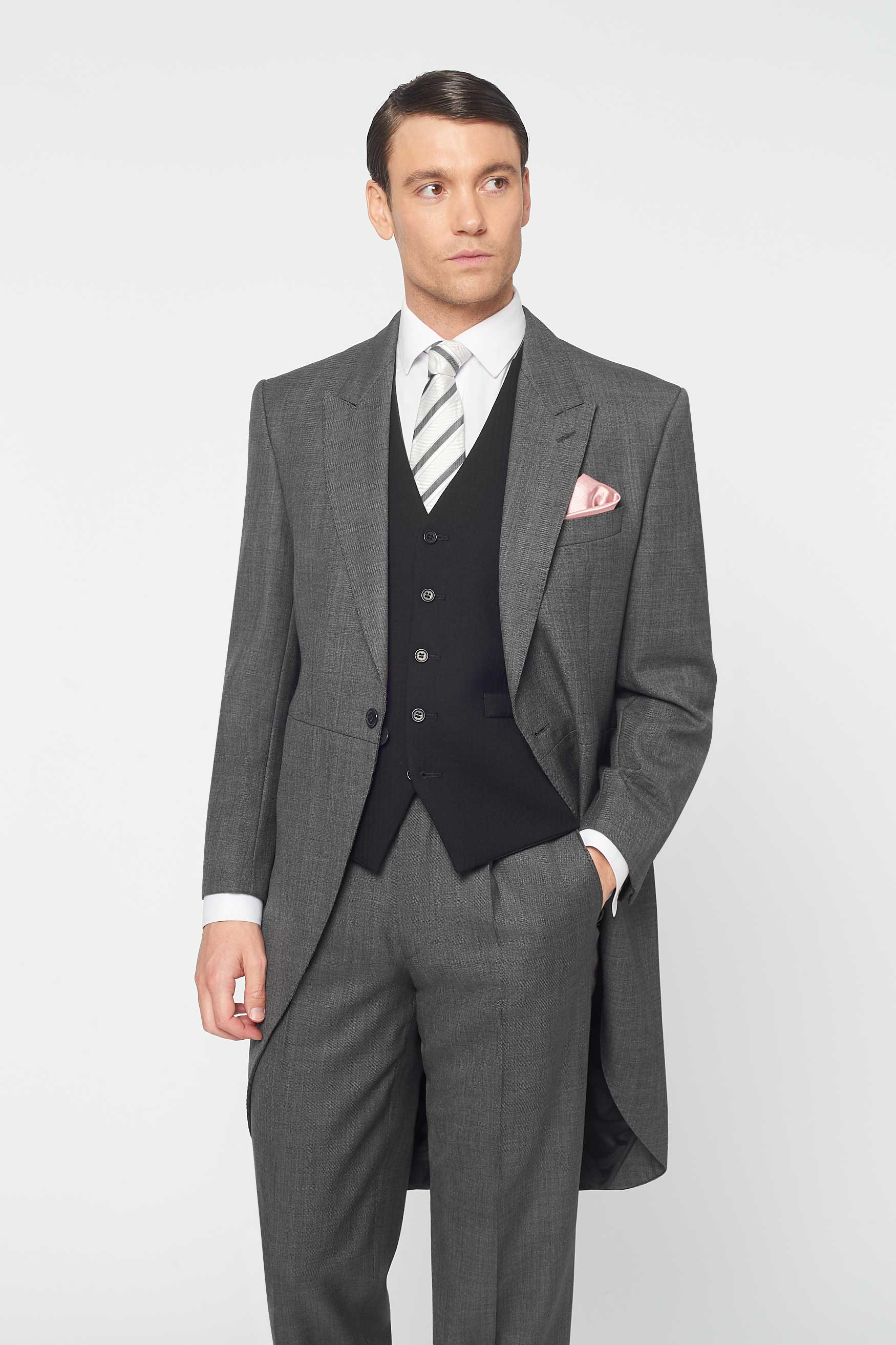 The Bidwell 3 Piece Morning suit in Mid Grey paired with the Black Herringbone waistcoat - Hire this belter of a morning suit and never look back. This 3 piece morning suit is perfect to rent for any formal occasion however it might be a bit overkill for parents evening. Runs true to size. If between jacket sizes, we recommend dropping down.
