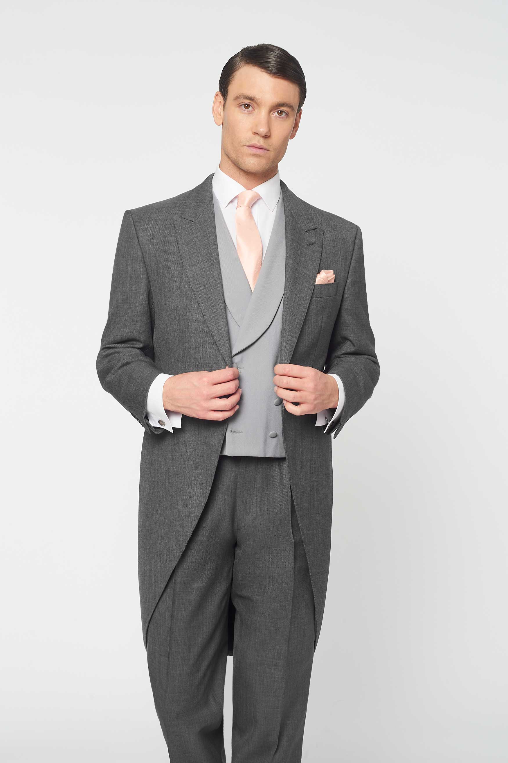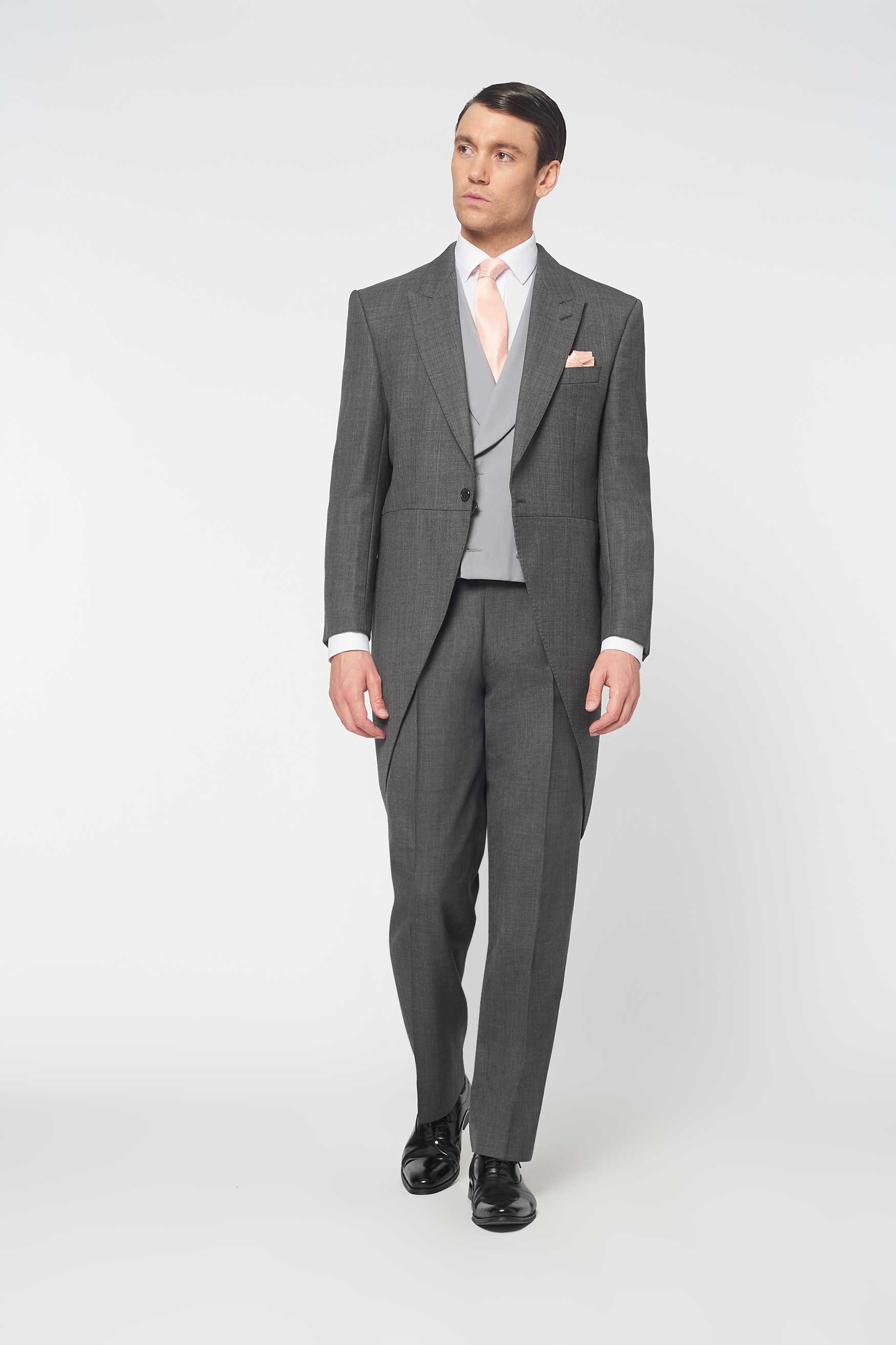 The Dove Grey Double Breasted waistcoat works perfectly with The Bidwell Mid Grey morning suit. Go ahead and hire this three piece morning suit with a timeless cut if you want to be the visual hit of the ball. Perfect to rent for Ascot and other race meets, wedding parties, or Friday night on the sofa if you so please. It's that fancy, that adaptable. Trousers run true to size. For the jacket sizes, we recommend dropping down.