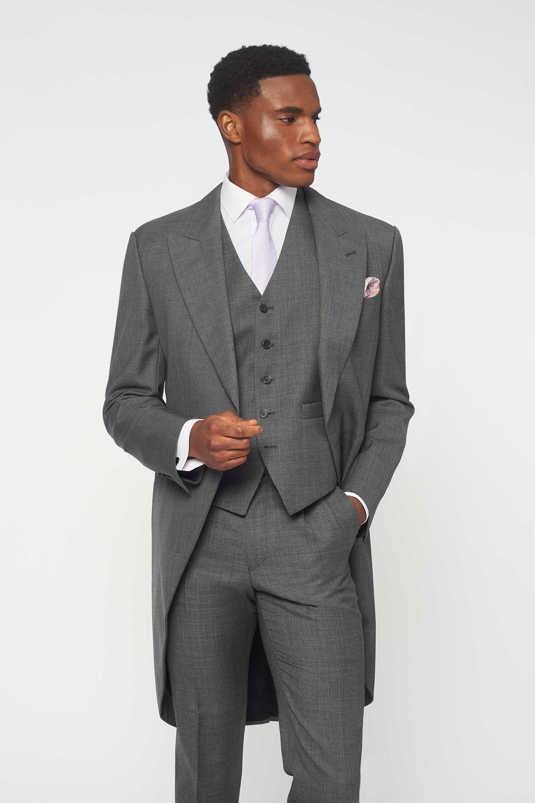 Hire this 3 piece morning suit in Mid Grey paired with matching waistcoat; perfect to rent for wedding parties, ascot and other race events, or just because you feel fancy. Hire this classic tailcoat with a regular cut and straight leg trouser. Trousers run true to size.  If between jacket sizes, we recommend dropping down.
