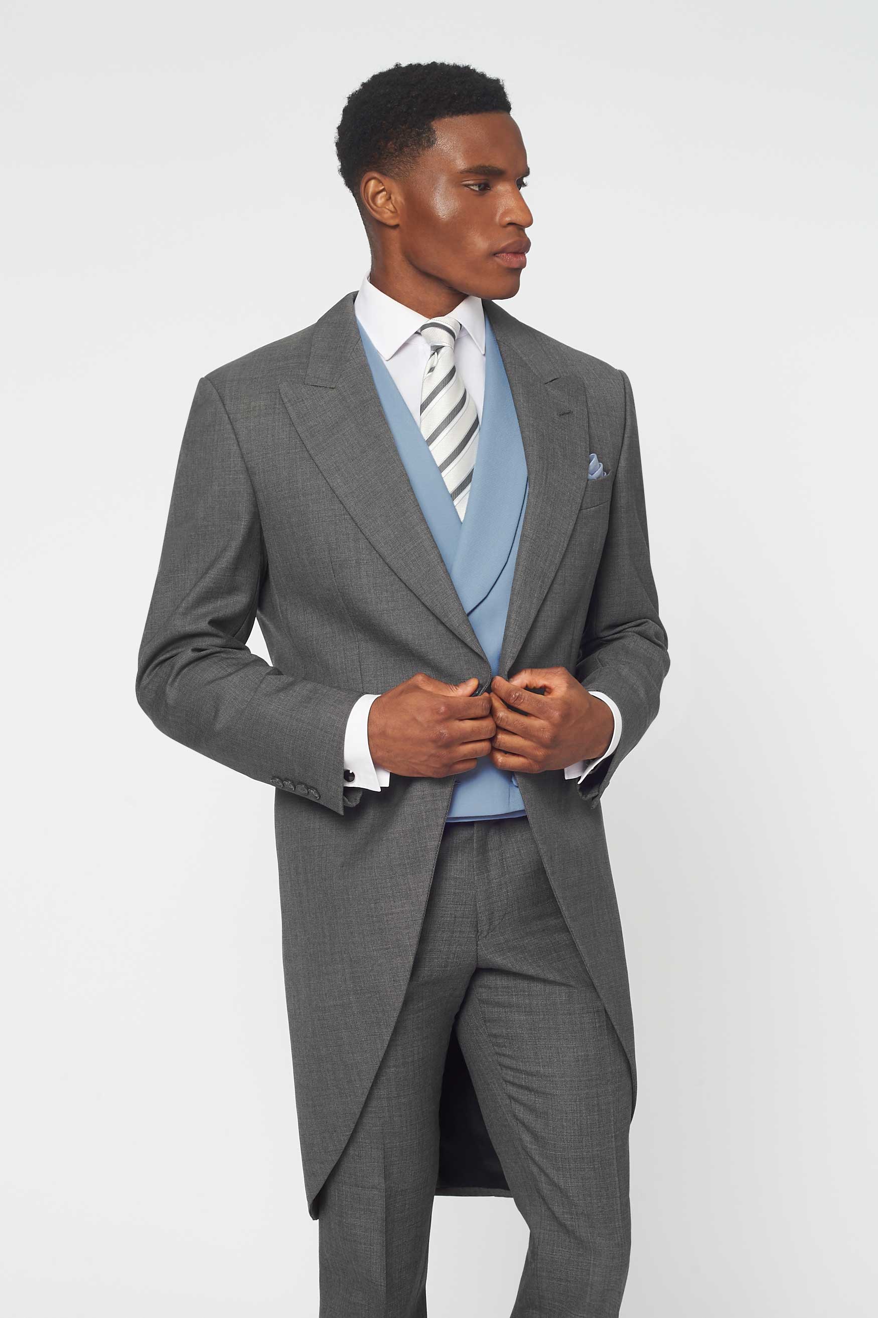 The Pale Blue Double Breasted waistcoat is super popular, never more so than when hired with The Bidwell morning suit in mid grey. Hire this classic morning suit from Rathbones Tailor for an elegant, timeless look. Never out of place at Ascot races or a wedding group photo. Trousers run true to size. For the jacket, we recommend dropping down a size.