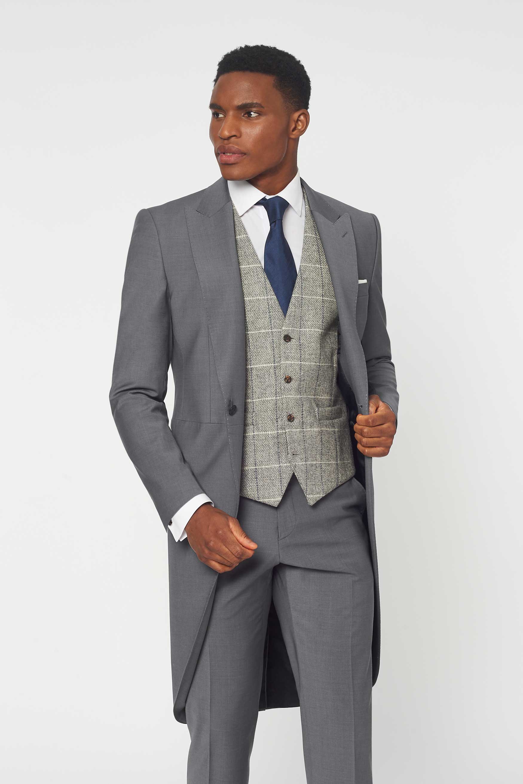 The Keadell Grey Slim fit tails with the Grey Tweed waistcoat - The classic tailcoat, re-cut for a more slim-fit look. Hire this tailcoat for timeless appeal but with a modern, lightweight edge. A perfect rental for Ascot, weddings and everything in between. Chase or be chased in this ensemble, unless you're the groom of course. You've already won. Rathbones Tailor recommends going up 2 inches in trouser waist. A 32" waist should opt for a 34" waist.