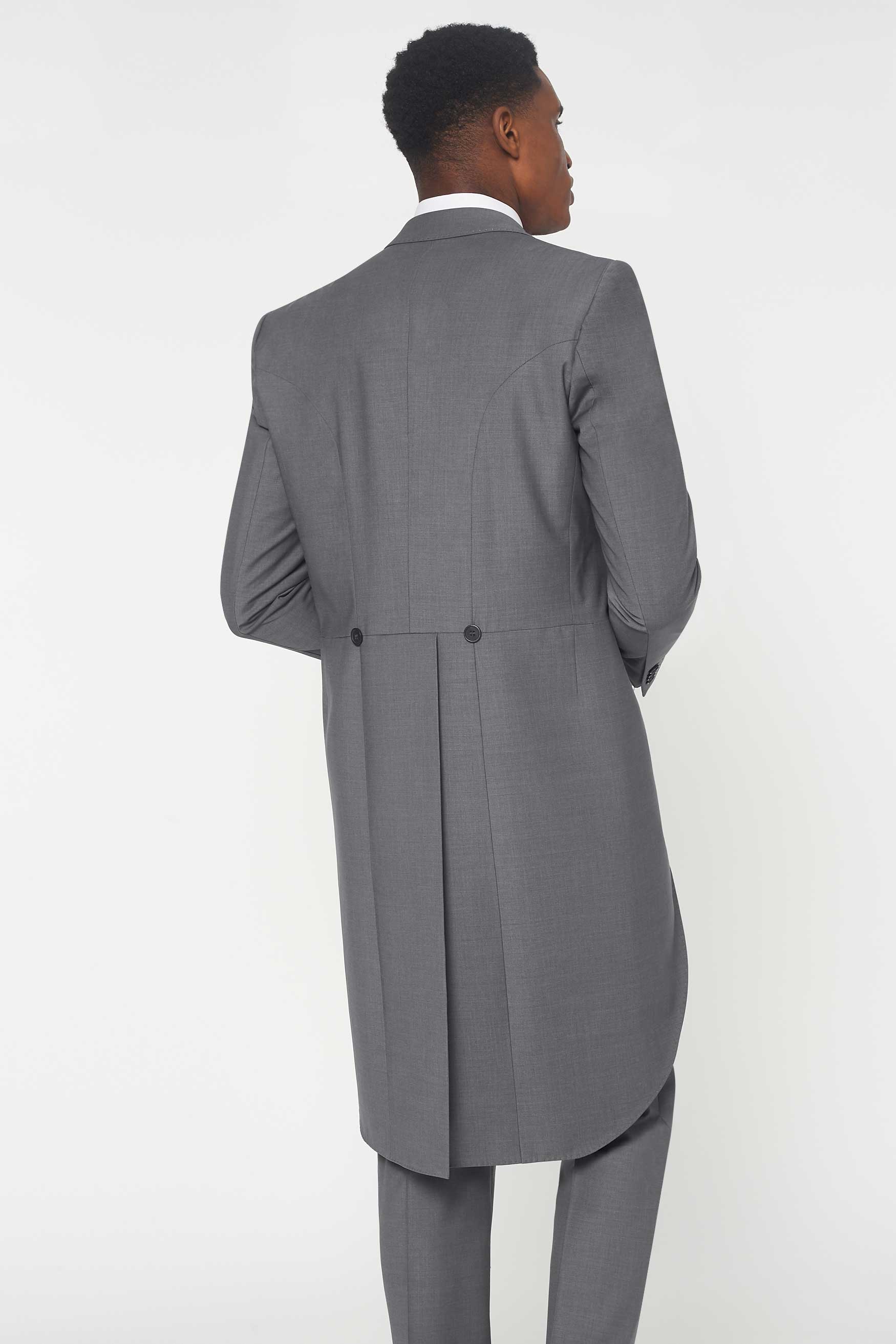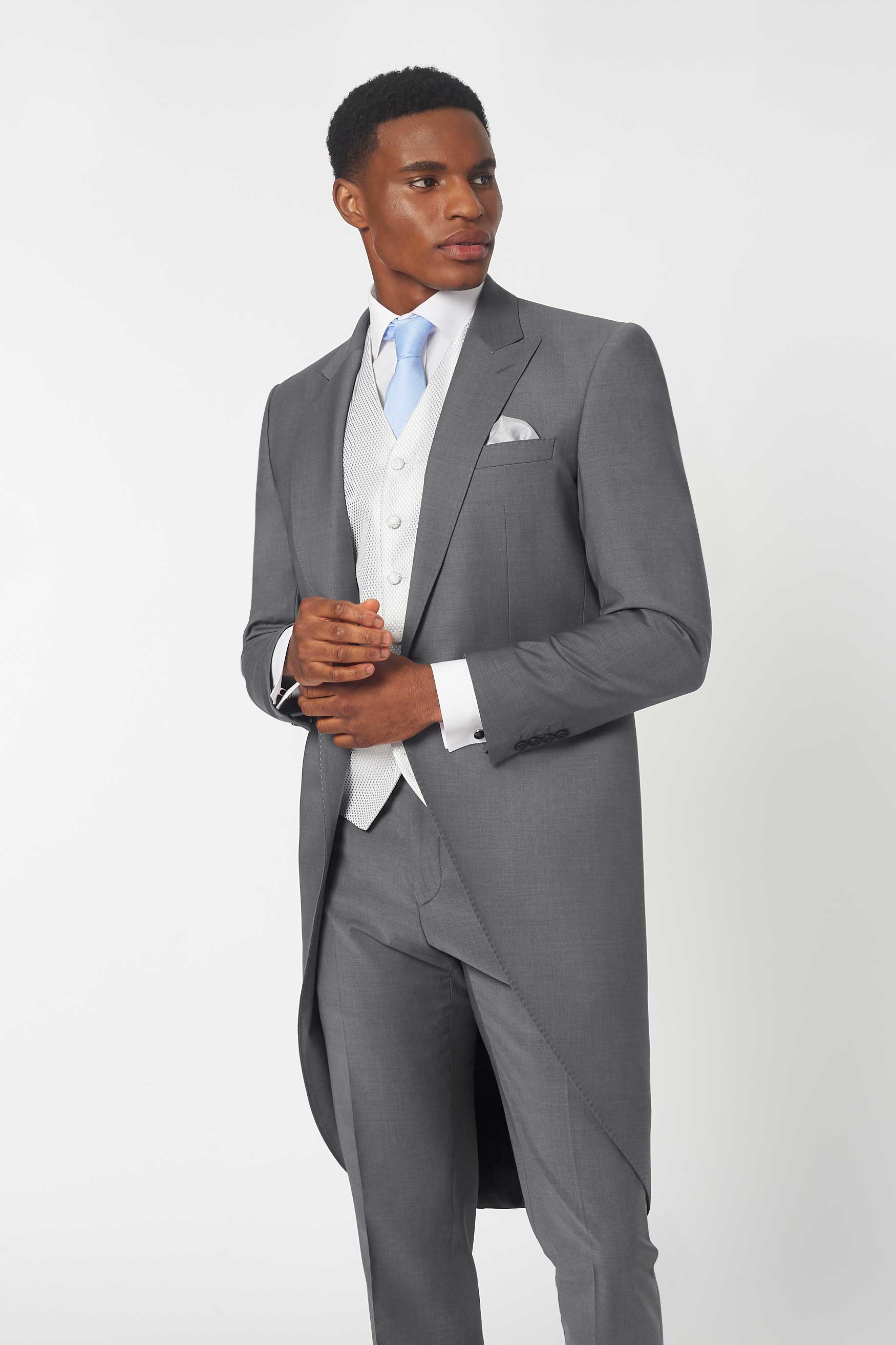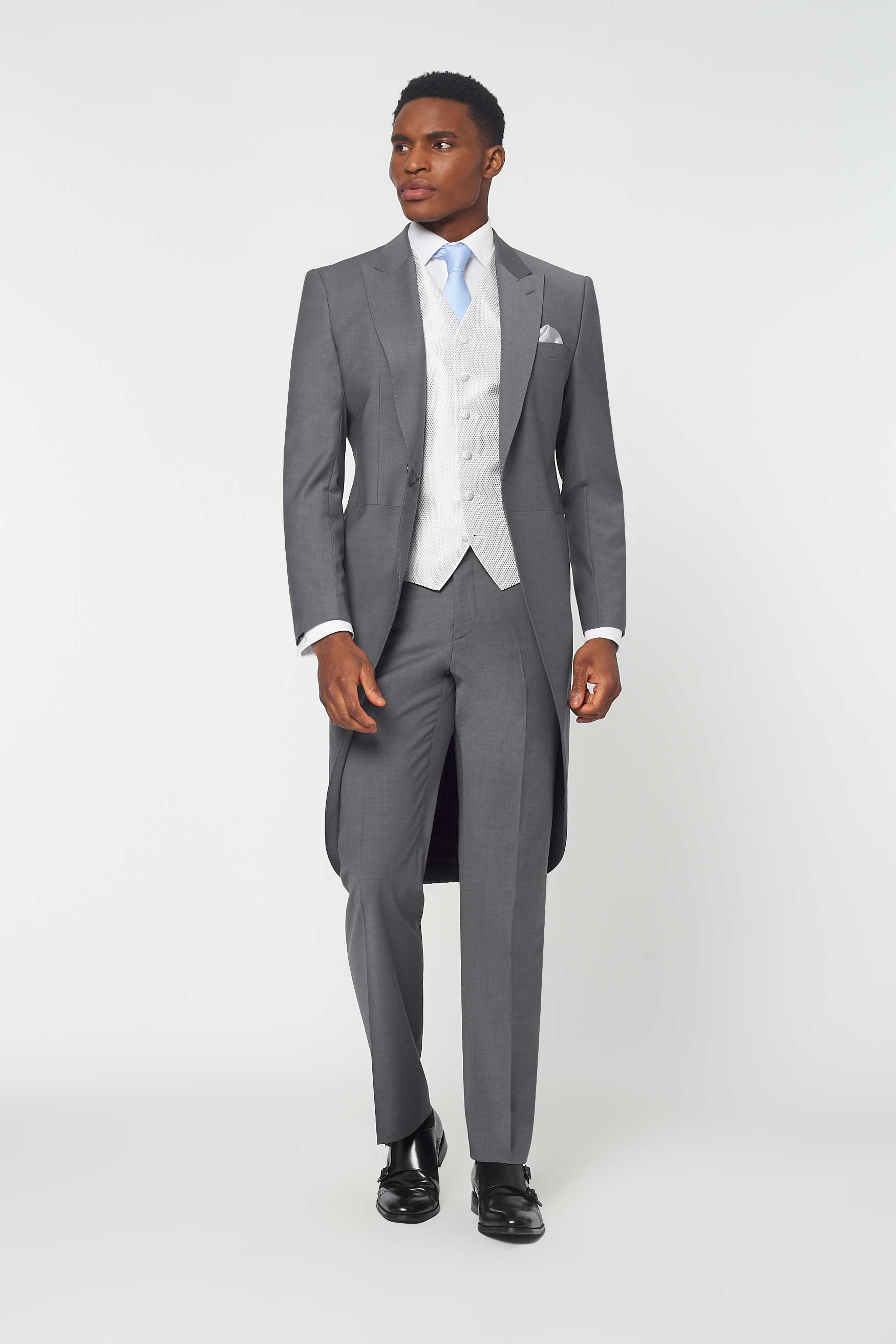 The Keadell Grey Slim fit tails with the Silver Dot waistcoat - The classic tailcoat, re-cut for a more slim-fit look. Hire this tailcoat for timeless appeal but with a modern, lightweight edge. A perfect rental for Ascot, weddings and everything in between. Chase or be chased in this ensemble, unless you're the groom of course. You've already won. Rathbones Tailor recommends going up 2 inches in trouser waist. A 32" waist should opt for a 34" waist.