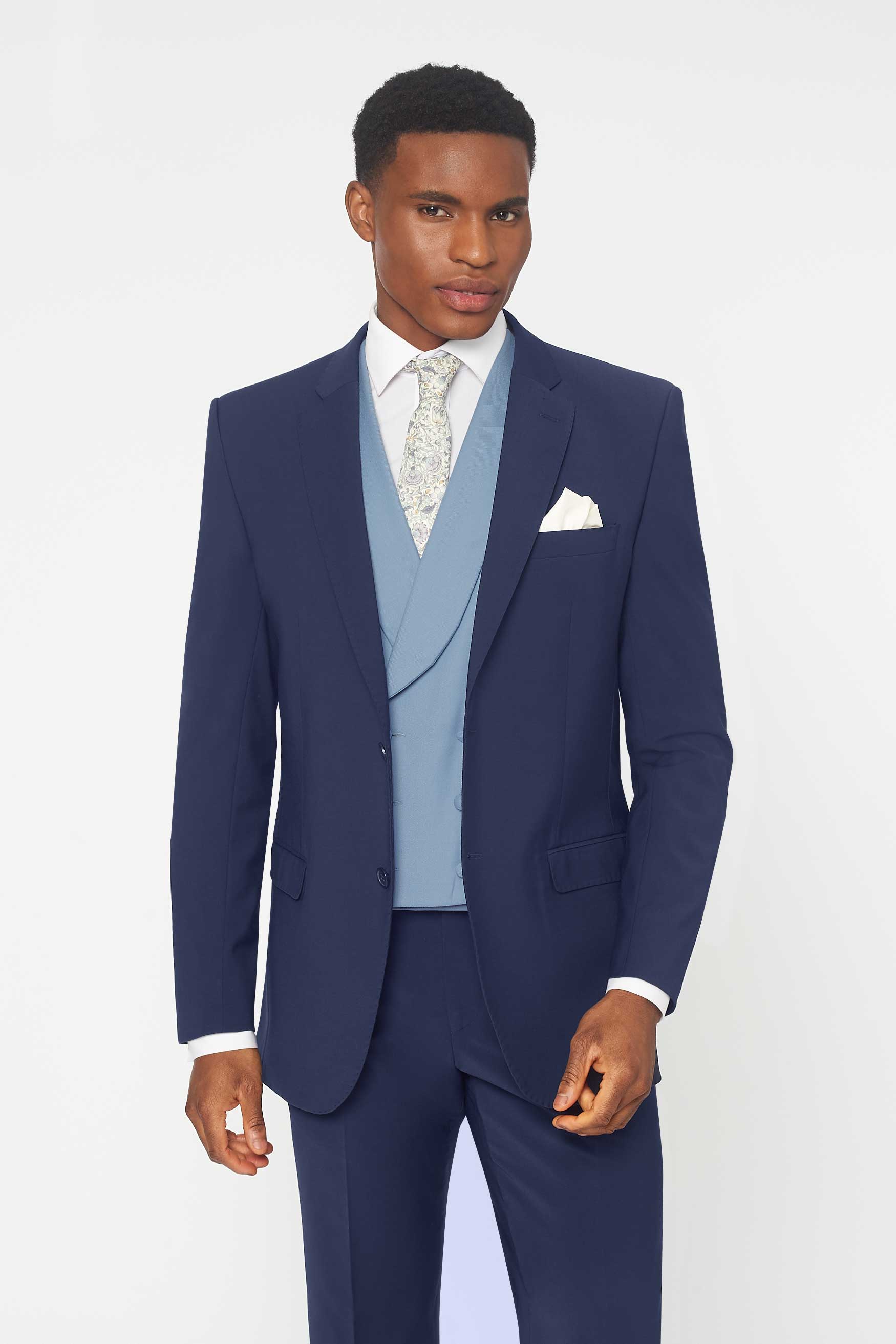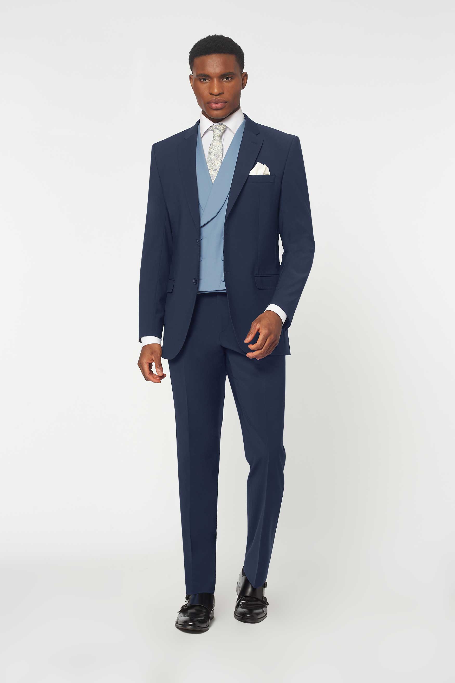 The Simkins Blue slim fit suit, paired with a Pale Blue Double Breasted waistcoat. A beautifully light weight suit with a tailored cut. Rent this slim fit suit to create a modern yet sophisticated look. Less formal than the tailcoat, an ideal choice to hire for weddings and the Queen Anne's enclosure at Ascot. When people ask who your personal tailor is... Rathbones of course. Rathbones Tailor recommends going up two inches in trouser waist. A 32" waist should wear a 34" trouser.
