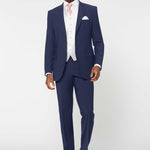 The Simkins Blue slim fit suit, paired with the Silver Dot waistcoat. A beautifully light weight suit with a tailored cut. Rent this slim fit suit to create a modern yet sophisticated look. Less formal than the tailcoat, an ideal choice to hire for weddings and the Queen Anne's enclosure at Ascot. When people ask who your personal tailor is... Rathbones of course. Rathbones Tailor recommends going up two inches in trouser waist. A 32" waist should wear a 34" trouser.