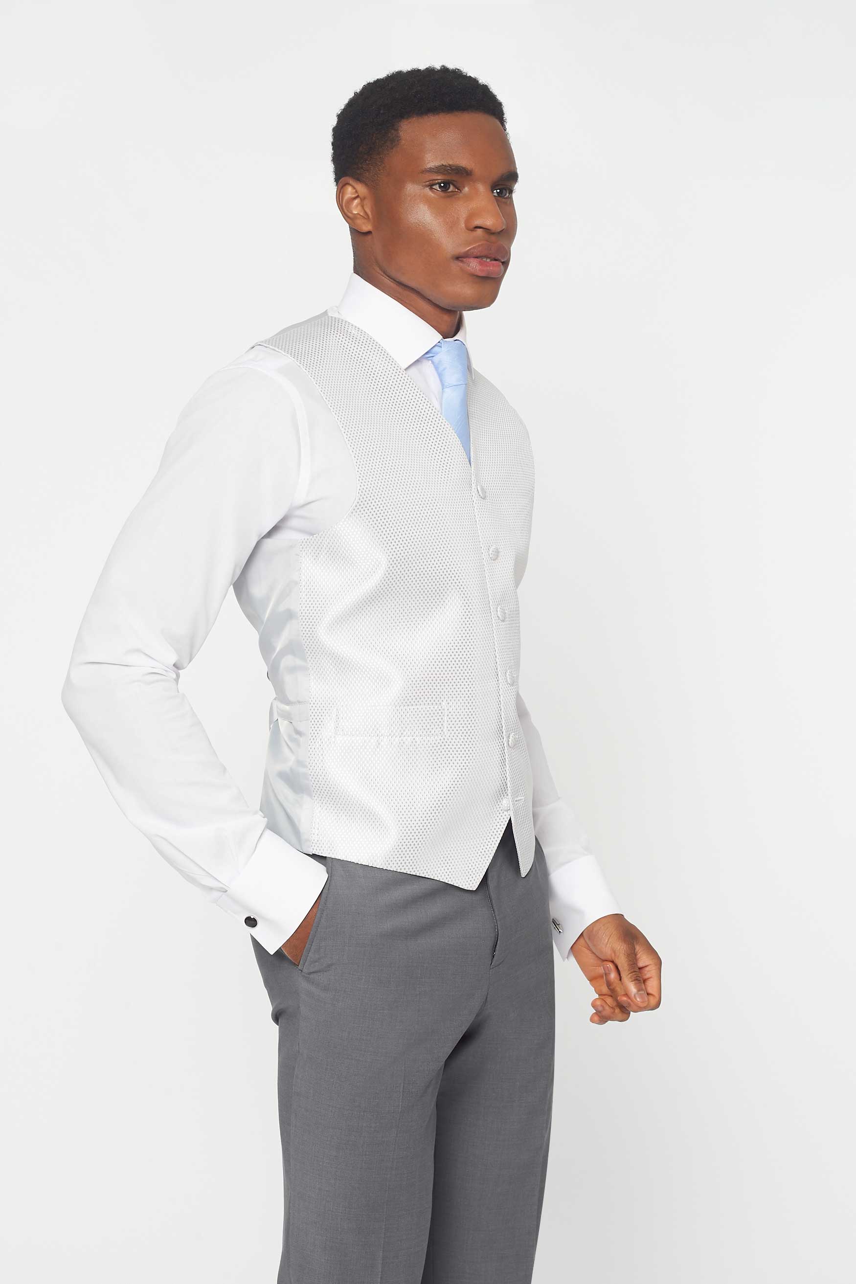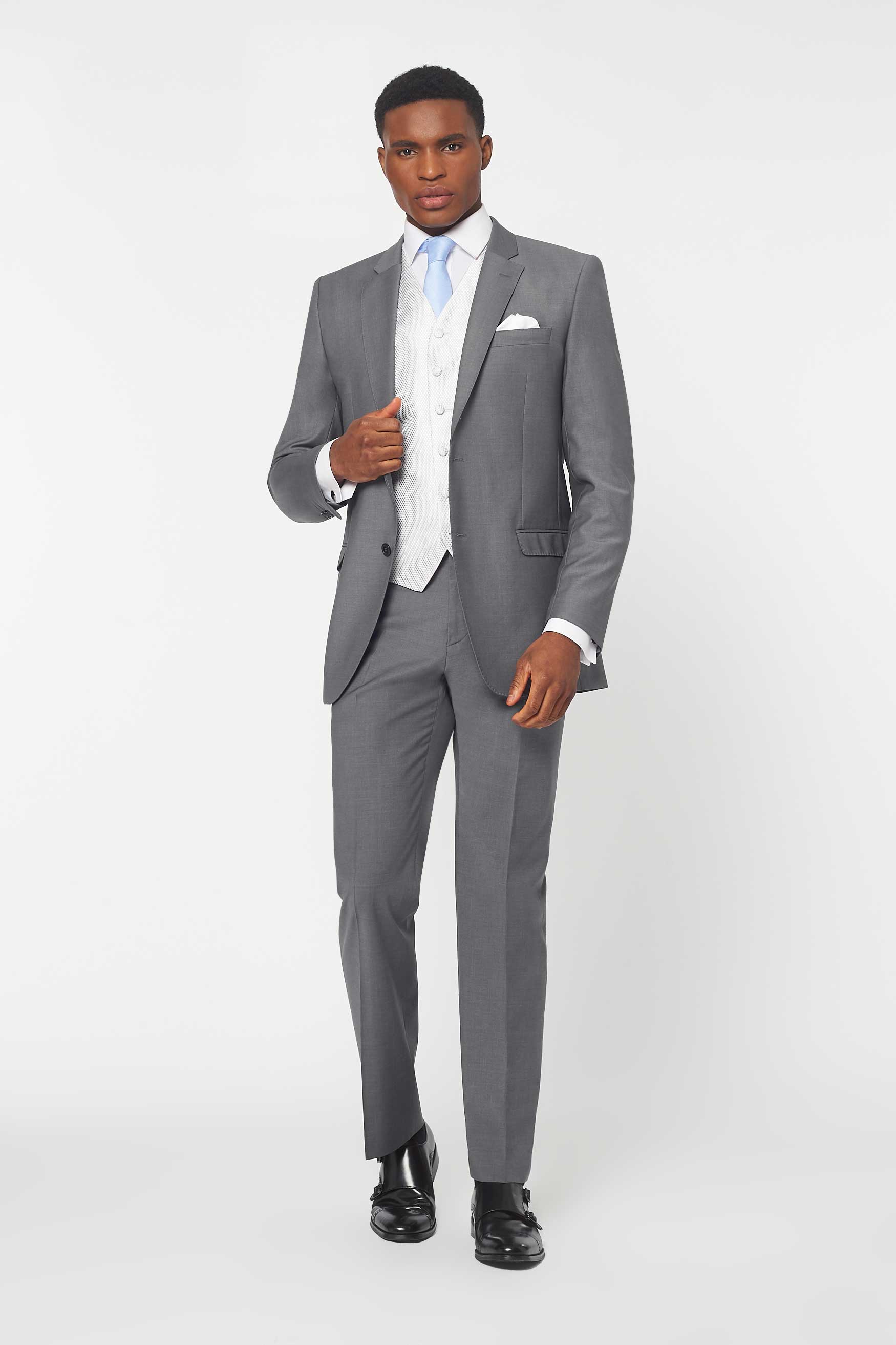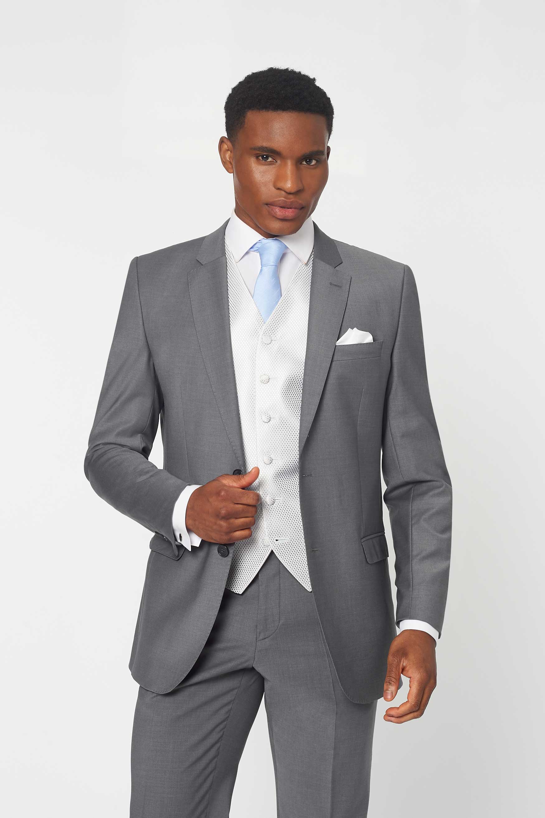 The Simkins Grey slim fit suit, paired with Silver Dot waistcoat. A beautifully light weight suit with a tailored cut. Rent this slim fit suit to create a modern yet sophisticated look. Less formal than the tailcoat, an ideal choice to hire for weddings and the Queen Anne's enclosure at Ascot. When people ask who your personal tailor is... Rathbones of course. Rathbones Tailor recommends going up two inches in trouser waist. A 32" waist should wear a 34" trouser.
