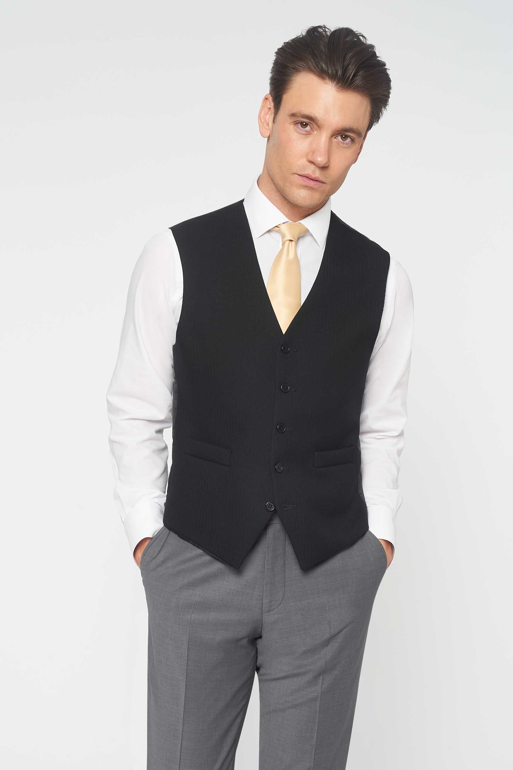 The Keadell Grey Slim fit tails with the Black Herringbone waistcoat - The classic tailcoat, re-cut for a more slim-fit look. Hire this tailcoat for timeless appeal but with a modern, lightweight edge. A perfect rental for Ascot, weddings and everything in between. Chase or be chased in this ensemble, unless you're the groom of course. You've already won. Rathbones Tailor recommends going up 2 inches in trouser waist. A 32" waist should opt for a 34" waist.