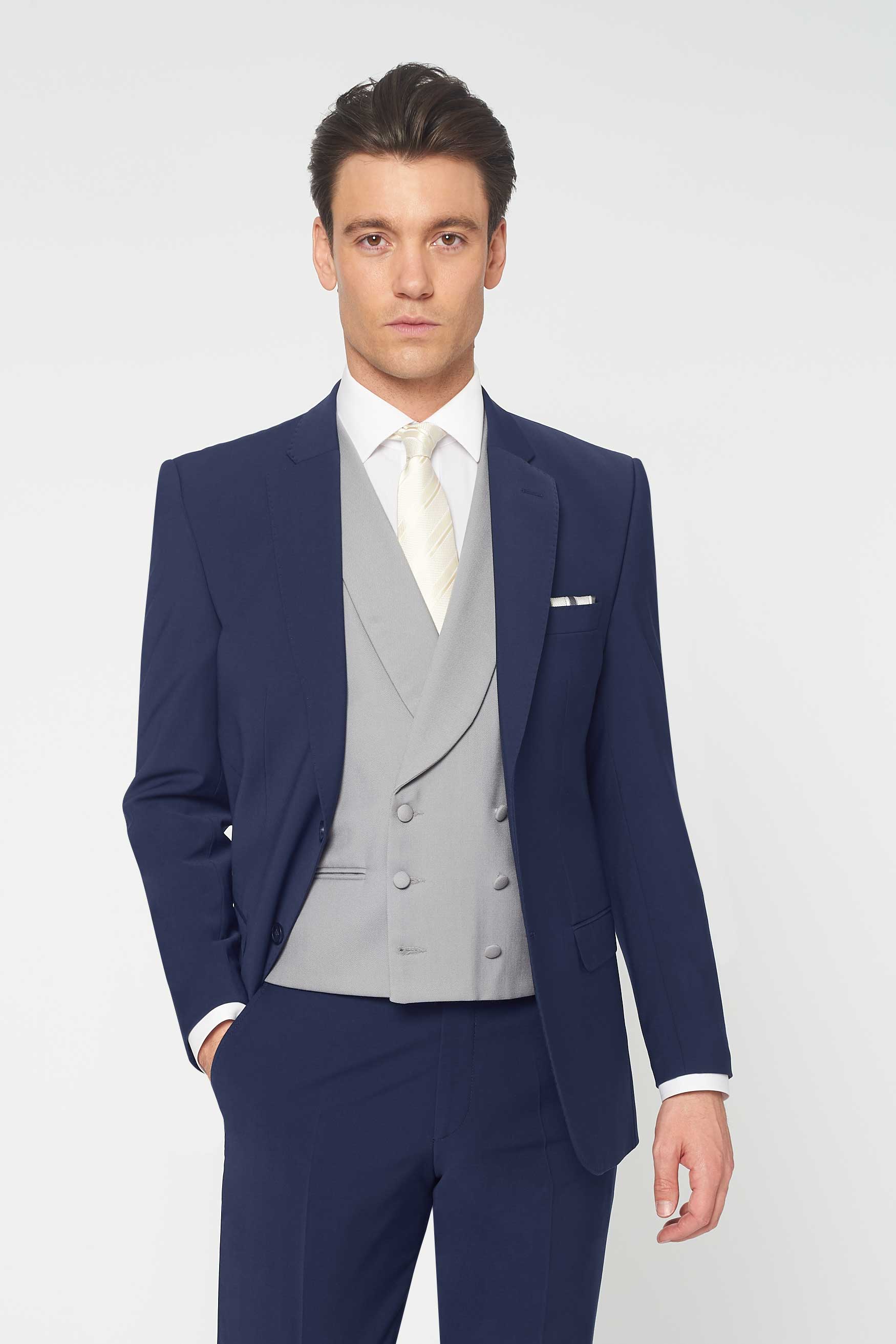 The Simkins Blue slim fit suit, paired with the St Albans Grey Double Breasted waistcoat. A beautifully light weight suit with a tailored cut. Rent this slim fit suit to create a modern yet sophisticated look. Less formal than the tailcoat, an ideal choice to hire for weddings and the Queen Anne's enclosure at Ascot. When people ask who your personal tailor is... Rathbones of course. Rathbones Tailor recommends going up two inches in trouser waist. A 32" waist should wear a 34" trouser.